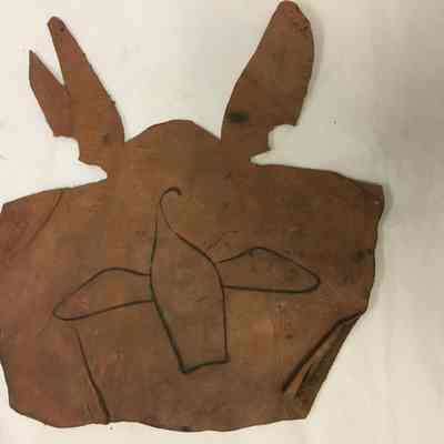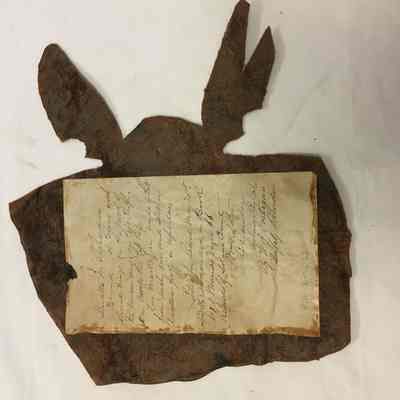 A copy of the original recording is adhered to the back of the piece. The brand is a goose with spread wings and is placed on the neck and left thigh of horses and on the left hip of cattle. The earmarkings are indicated on the top of the piece.Collection