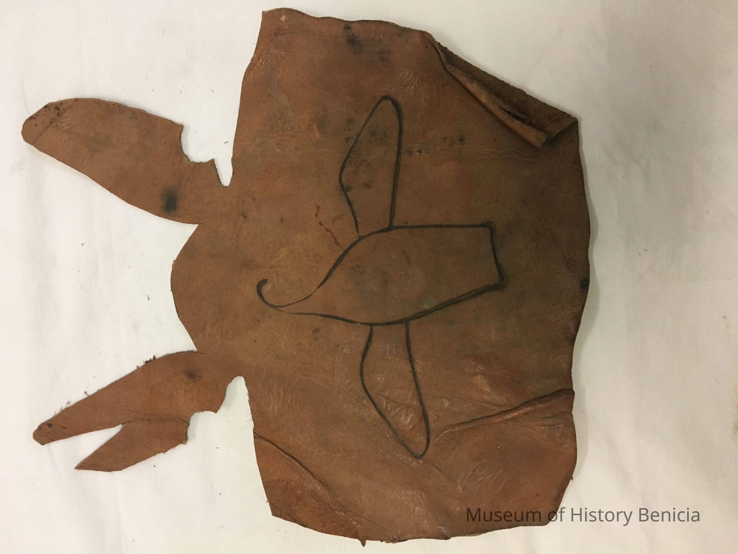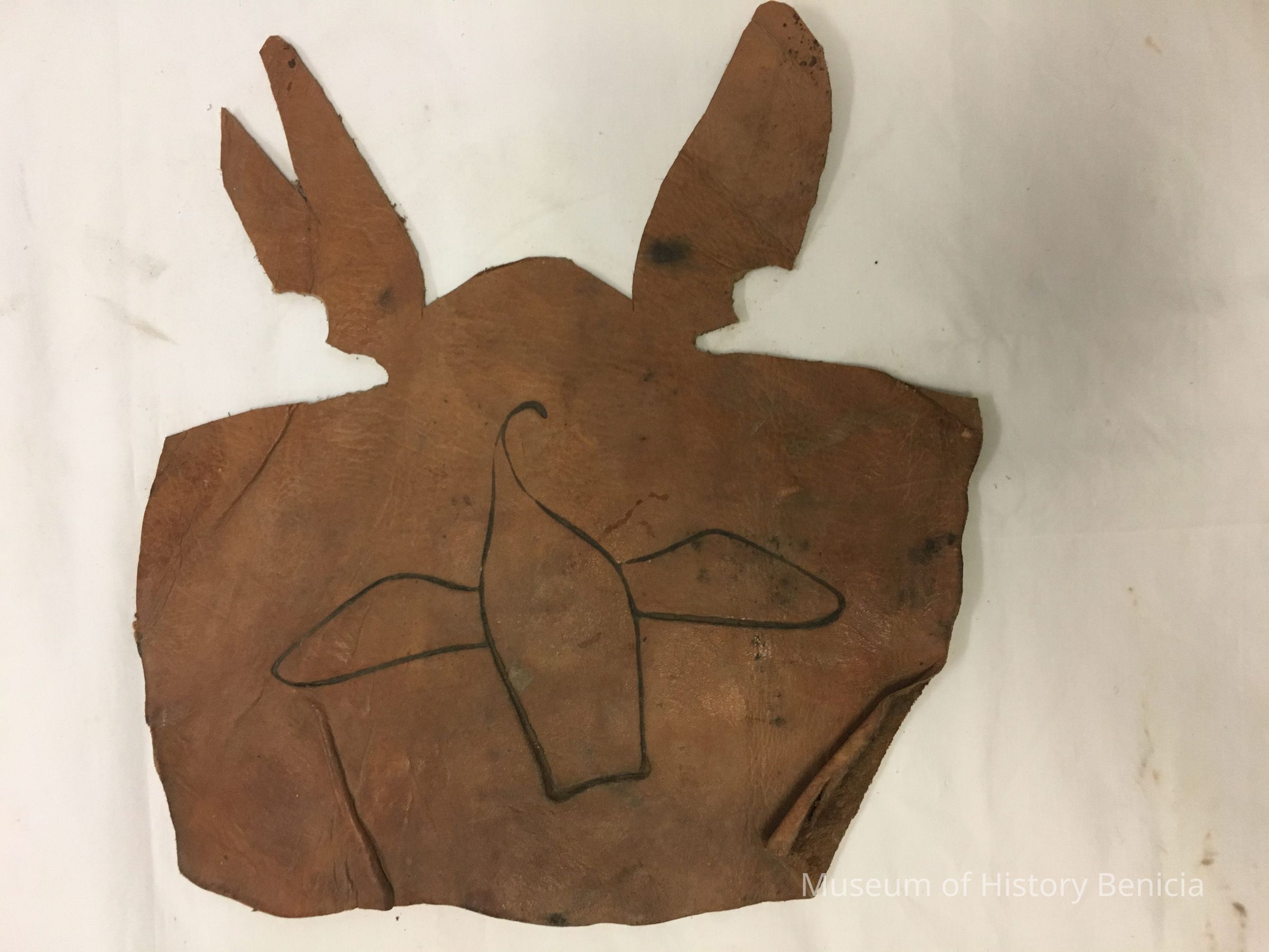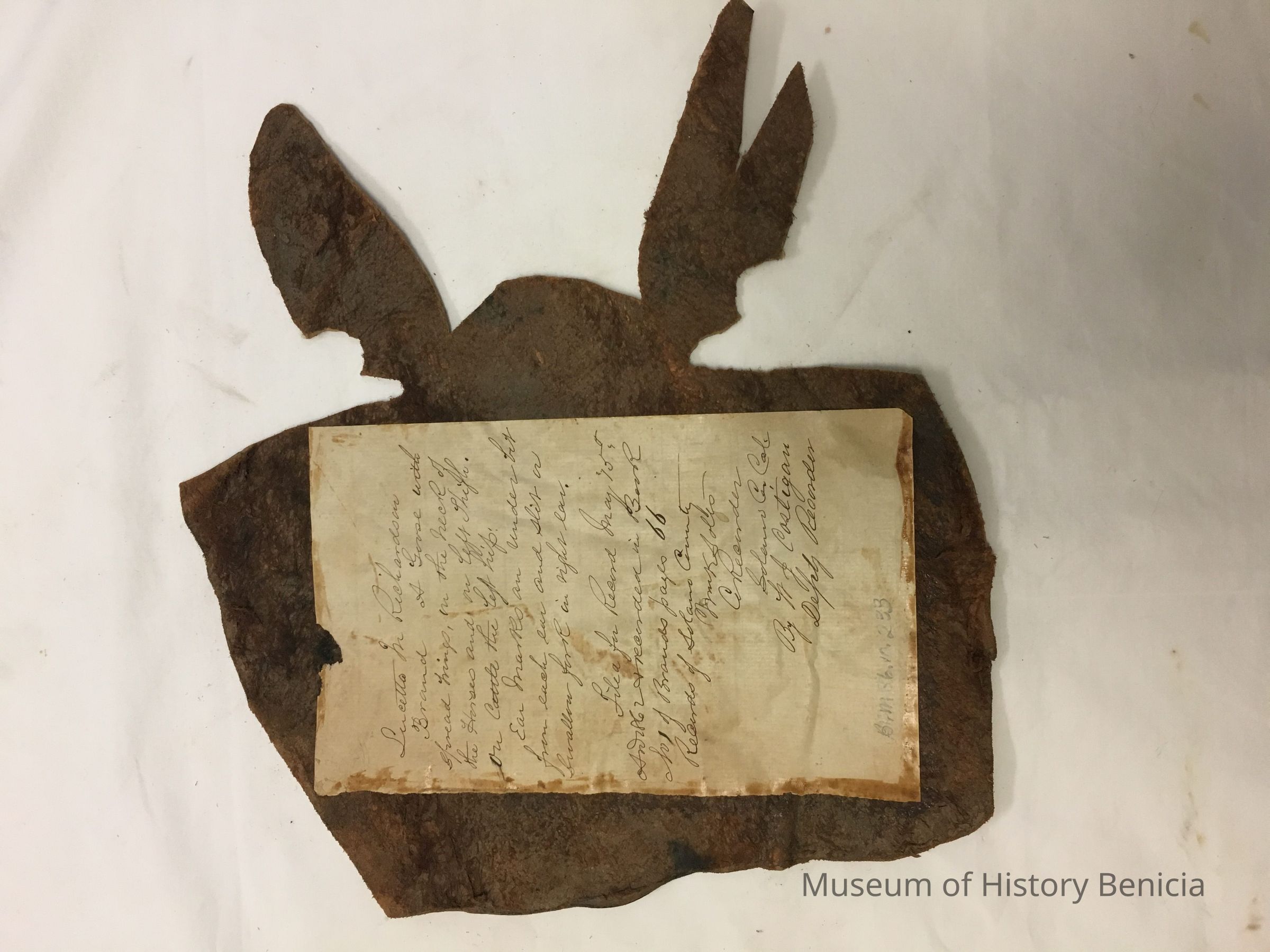 Sample brand/earmarkings on a piece of leather for Lucetta M. Richardson, registered May 15, 1862, and is written in a Ledger of the Solano County Recorder 1855-1916. (page 66)