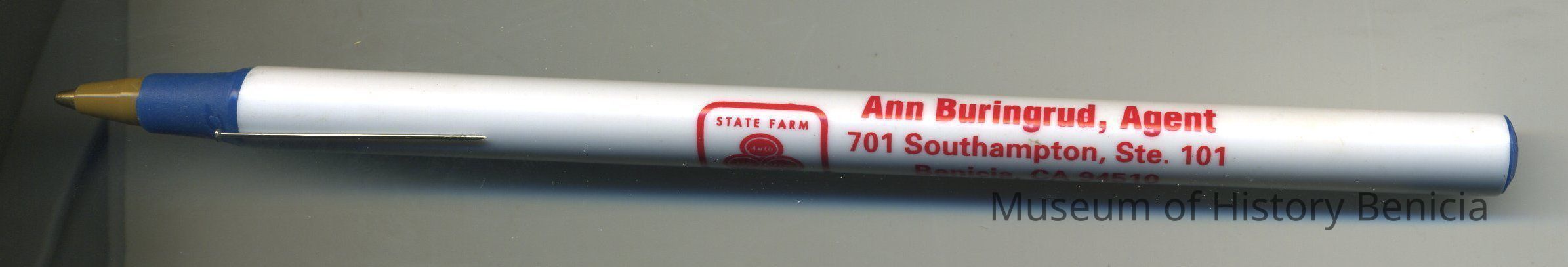 Advertising Ballpoint Pen, removable blue cap with pocket clip is missing; pen body white with red lettering: State Farm Insurance Logo and "Ann Buringrud, Agent / 701 Southampton, Ste. 101 / Benicia, CA 94510 / Bus: 707-746-0350 / Fax: 707-746-1794" 5-5/8" longCollection