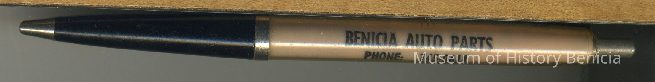 Advertising Ballpoint Pen, two-tone: bottom plain black; there is an open/close button and pocket clip on top; upper section has company name under plastic; black lettering on beige background: "Benicia Auto Parts / Phone 745-0611 / 915 First Street / Benicia, California / J.A. (Zeck) Moreira, Prop." 5-1/8" longCollection