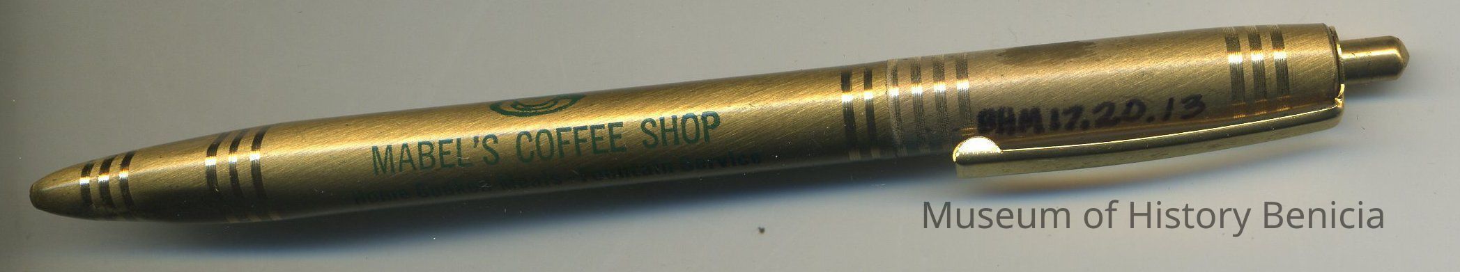 Advertising Ballpoint Pen, gold with click open/close button on top; black lettering: coffee cup logo and "Mabel's Coffee Shop / Home Cooked Meals - Fountain Service / Phone 745-9927 / 635 First Str. Benicia, Calif. 94510" 5" long; "wings" on pocket clip but no maker name.Collection