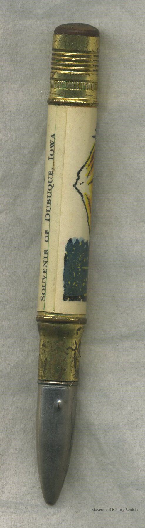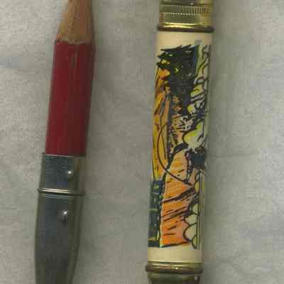 Red, wood pencil with silver metal cap on end; point fits into pencil-like case with a drawing of fisherman and the words "Souvenir of Dubuque, Iowa" on one side; there is a well used eraser on the opposite end of the point.