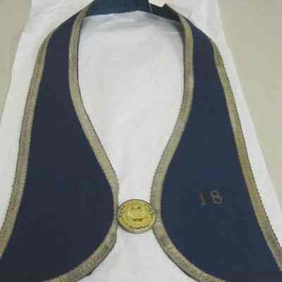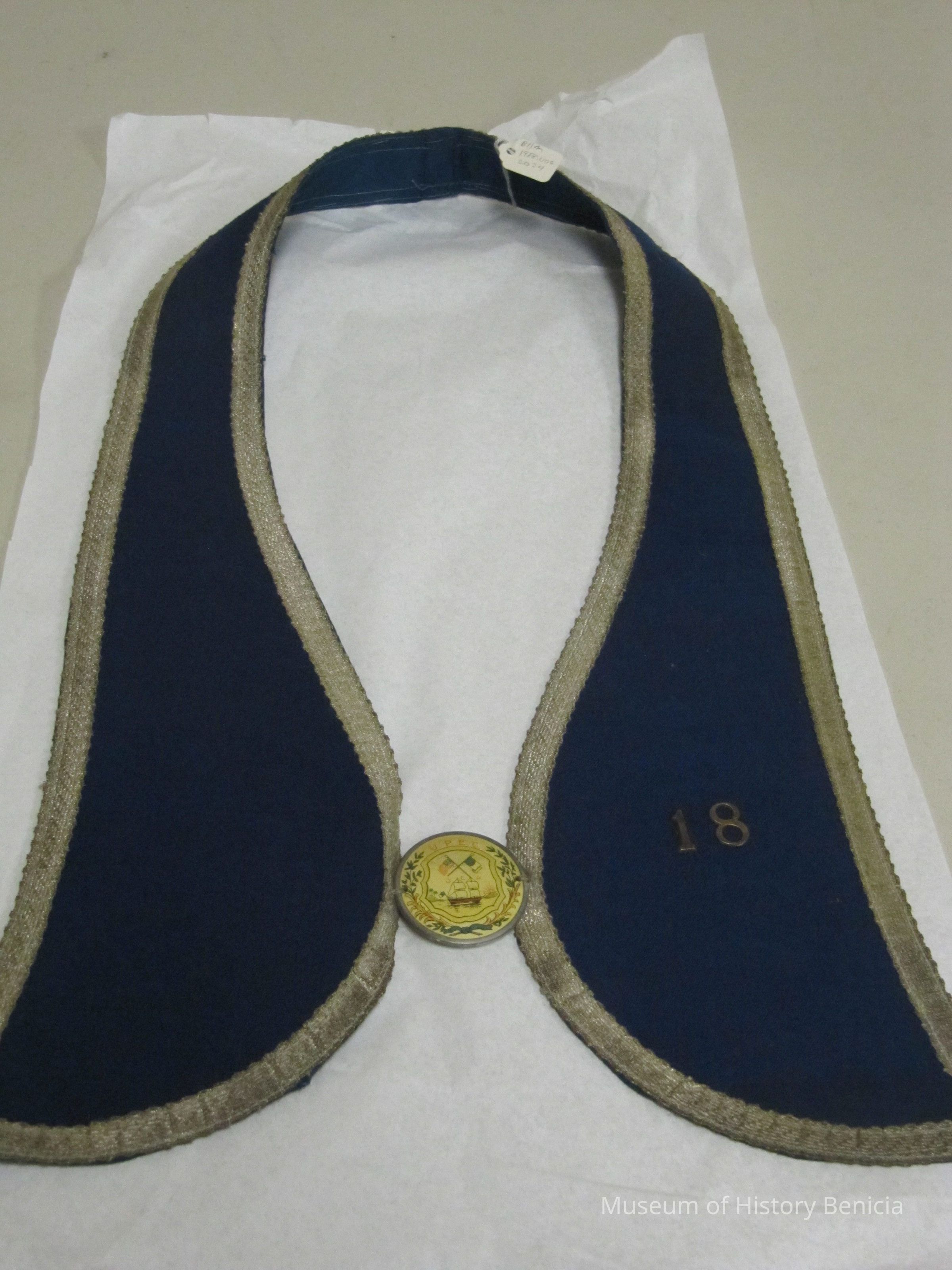 Dark blue and gold braided fabric with yellow plastic ceremonial badge. Lodge # 18 UPEC. U.P.E.C. Unido Portuguesa do Estado California (United Portuguese of the United States)Collection