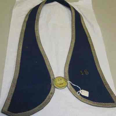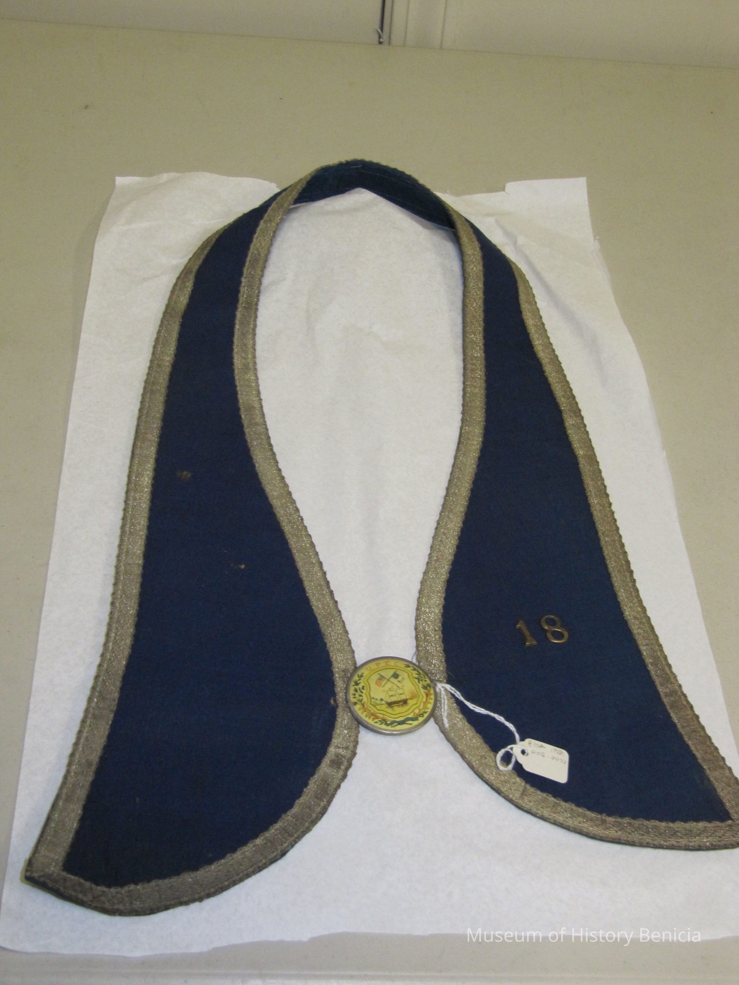 Dark blue and gold braided fabric with yellow plastic ceremonial badge. Lodge # 18 UPEC. U.P.E.C. Unido Portuguesa do Estado California (United Portuguese of the United States)Collection