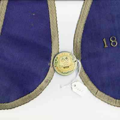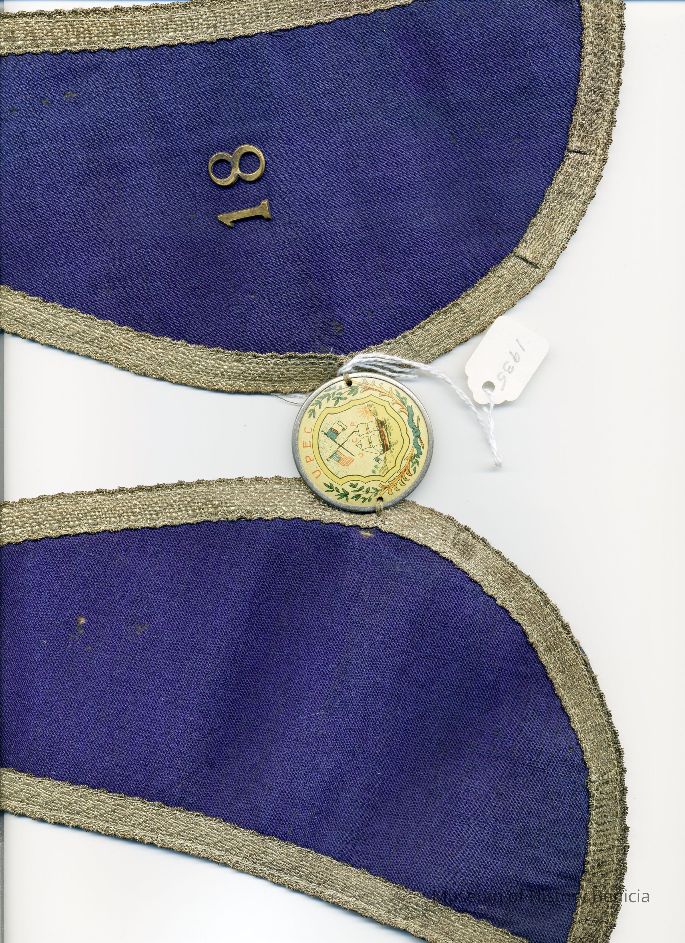Dark blue and gold braided fabric with yellow plastic ceremonial badge. Lodge # 18 UPEC. U.P.E.C. Unido Portuguesa do Estado California (United Portuguese of the United States)Collection