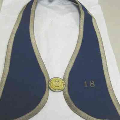 Dark blue and gold braided fabric with yellow plastic ceremonial badge. Lodge # 18 UPEC. U.P.E.C. Unido Portuguesa do Estado California (United Portuguese of the United States)Collection