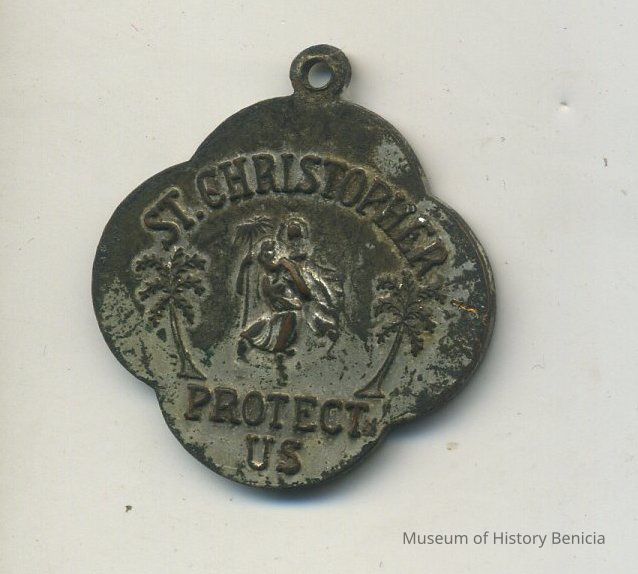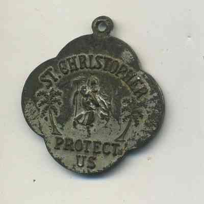 back: "St. Christopher Protect Us" above a figure between two palm trees; 1" x 1".Collection