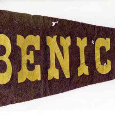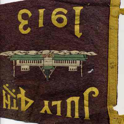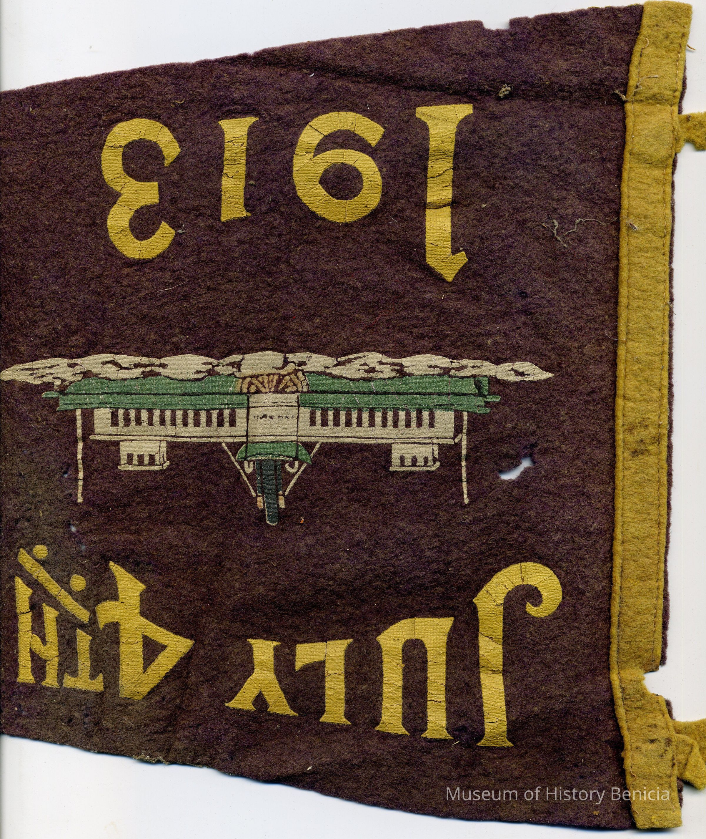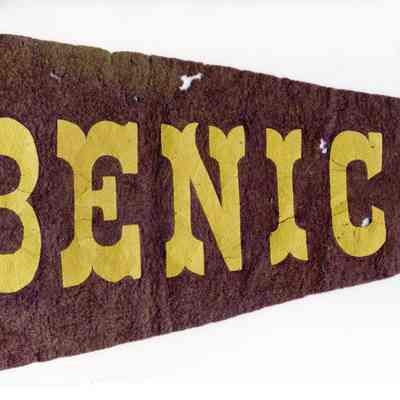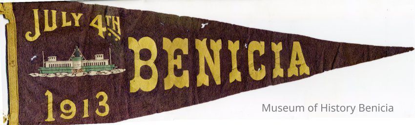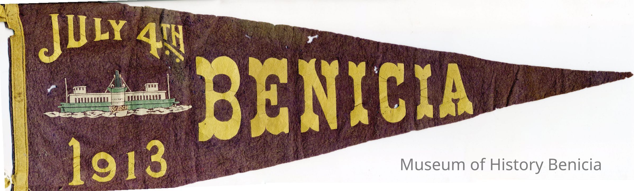 A 1913 purple and gold pennant made for the July 4th celebration in Benicia for 1913. It has a picture of a ferry boat on the front. It is 15" long and 10" wide at the widest point. It has two fabric ties on the end.Collection