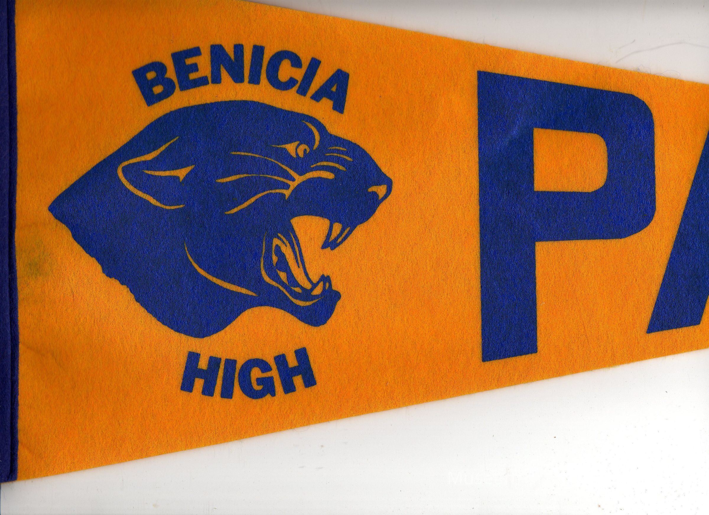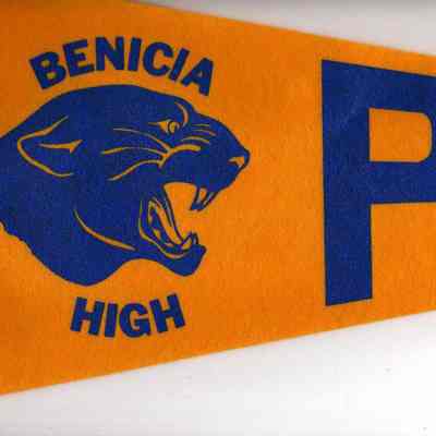 The image features a triangular pennant with a vibrant orange background and bold blue lettering that reads "BENICIA HIGH," accompanied by a fierce, stylized illustration of a panther's head, which appears to be roaring, displaying a prominent open mouth with visible sharp teeth; the word "PANTHERS" is partially visible, signifying the school mascot, creating an impression of school spirit and pride, as the contrasting colors enhance visibility, symbolizing energy and dynamism associated with the high school's