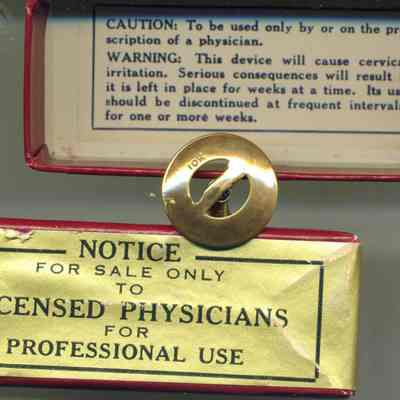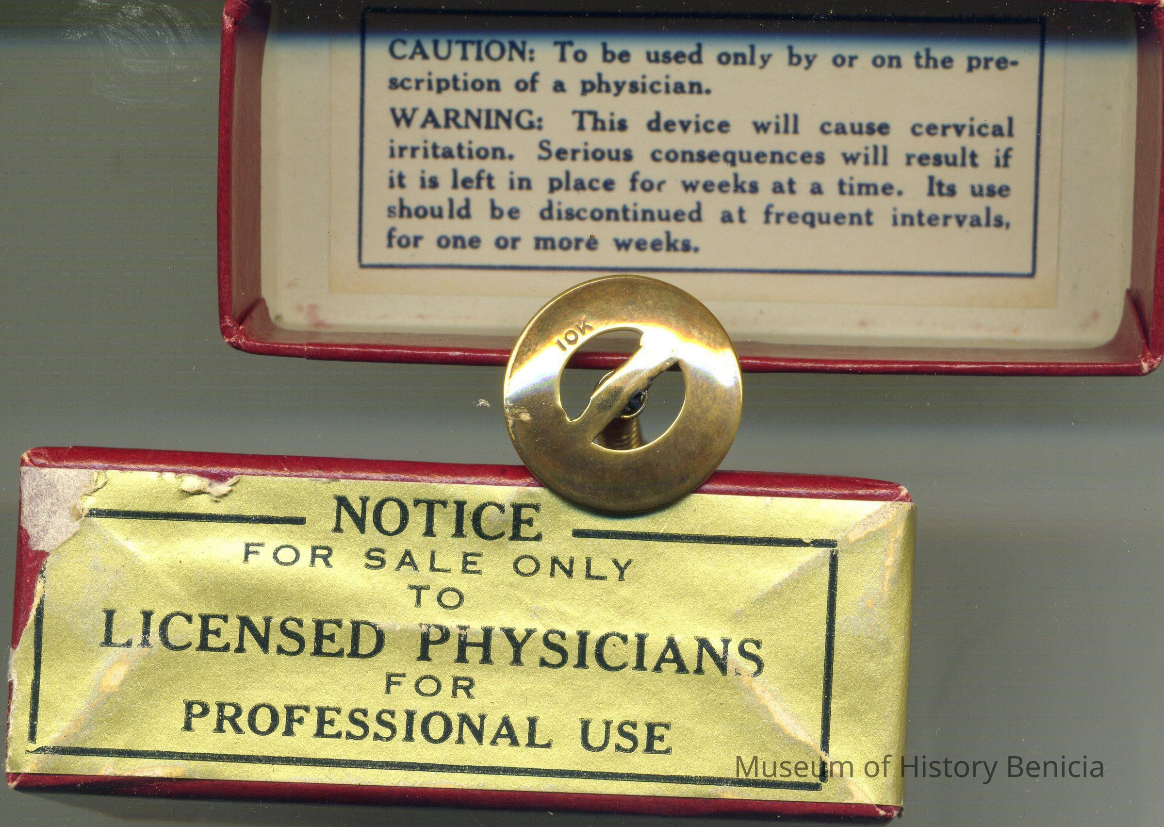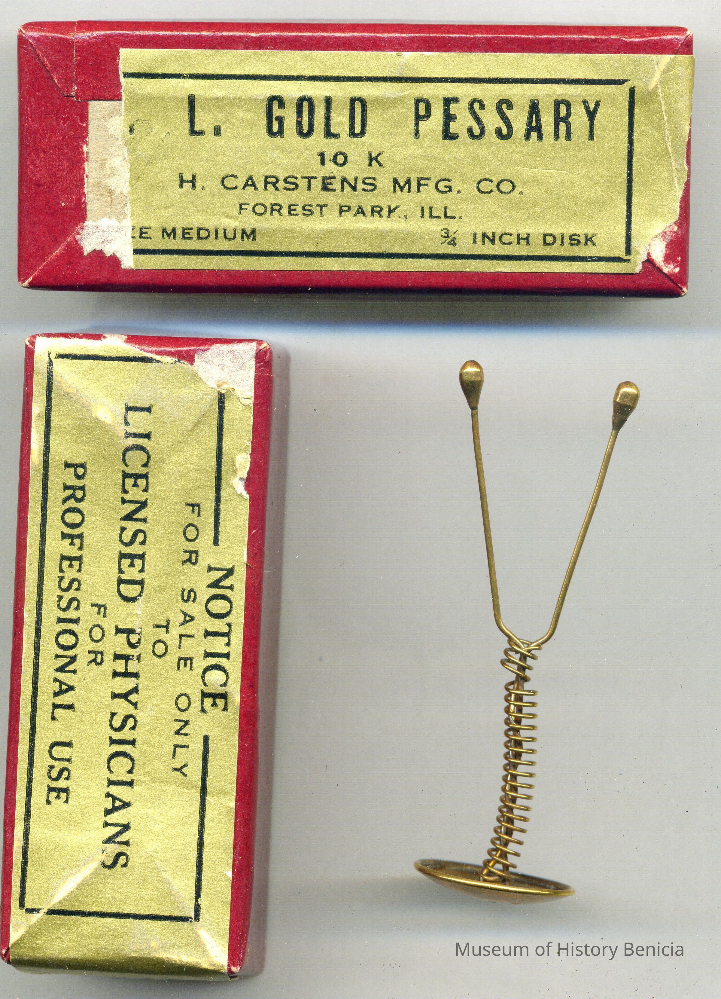 A red cardboard box with the label "L. Gold Pessary". It is made by H. Carstens Mfg Co. of Forest Park, Ill. It says that the device is 3/4 " disk.