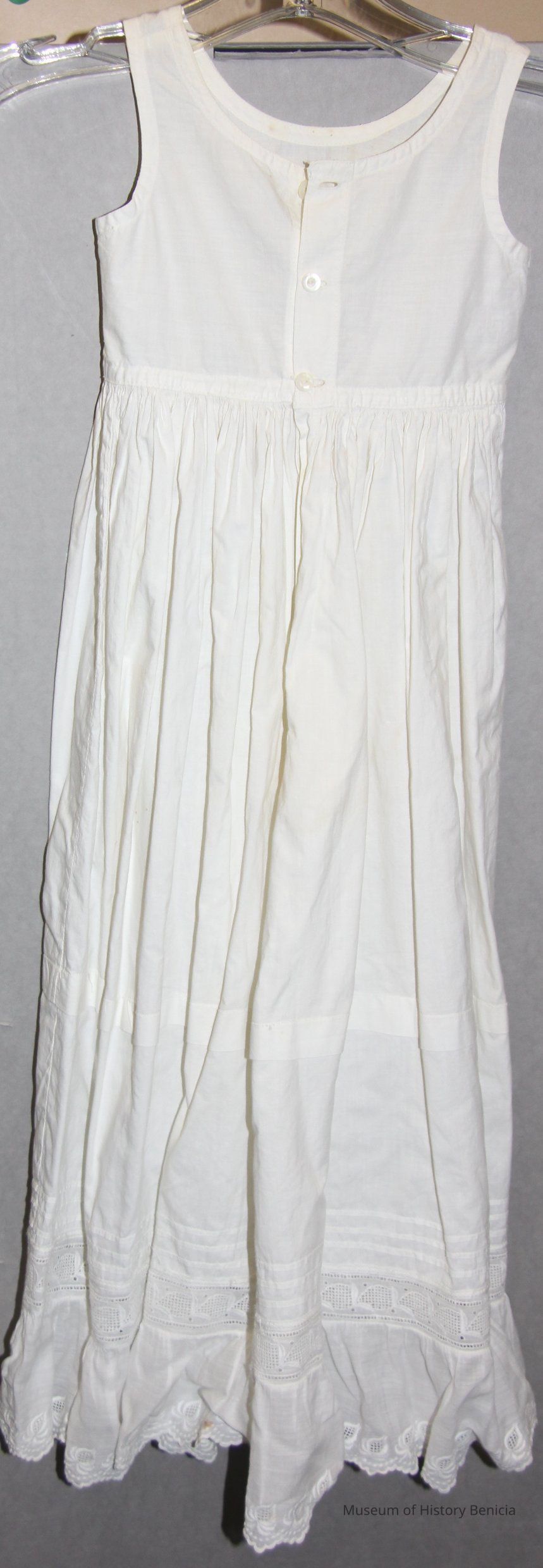 Sleeveless white child's petticoat with lace ruffle on bottom with tuck. Has embroidered ruffle.
