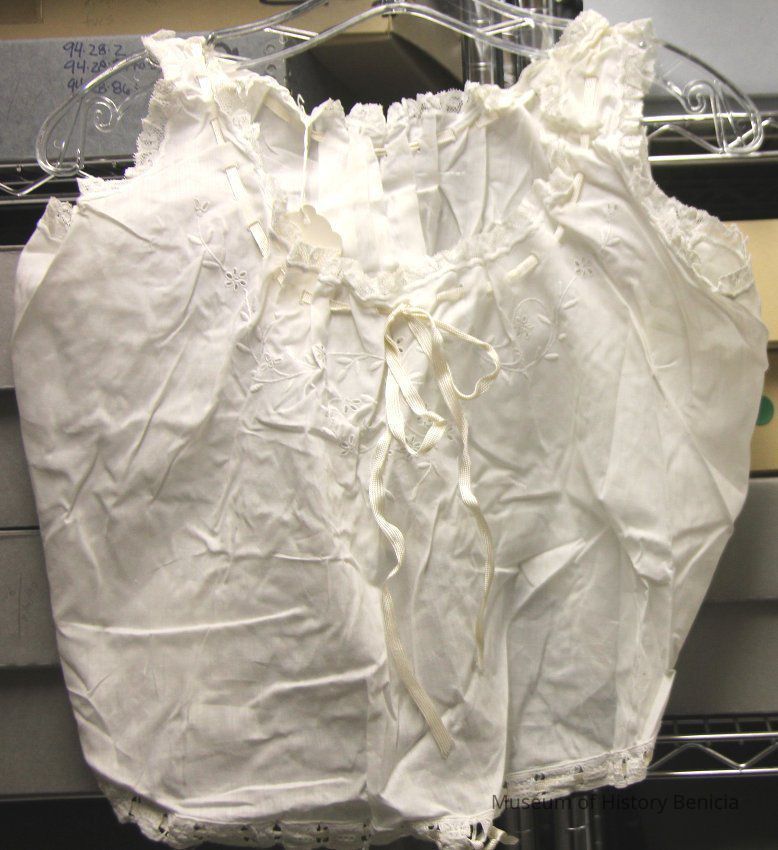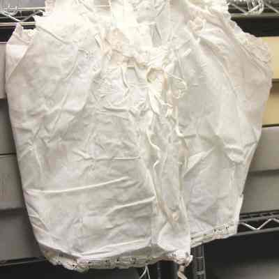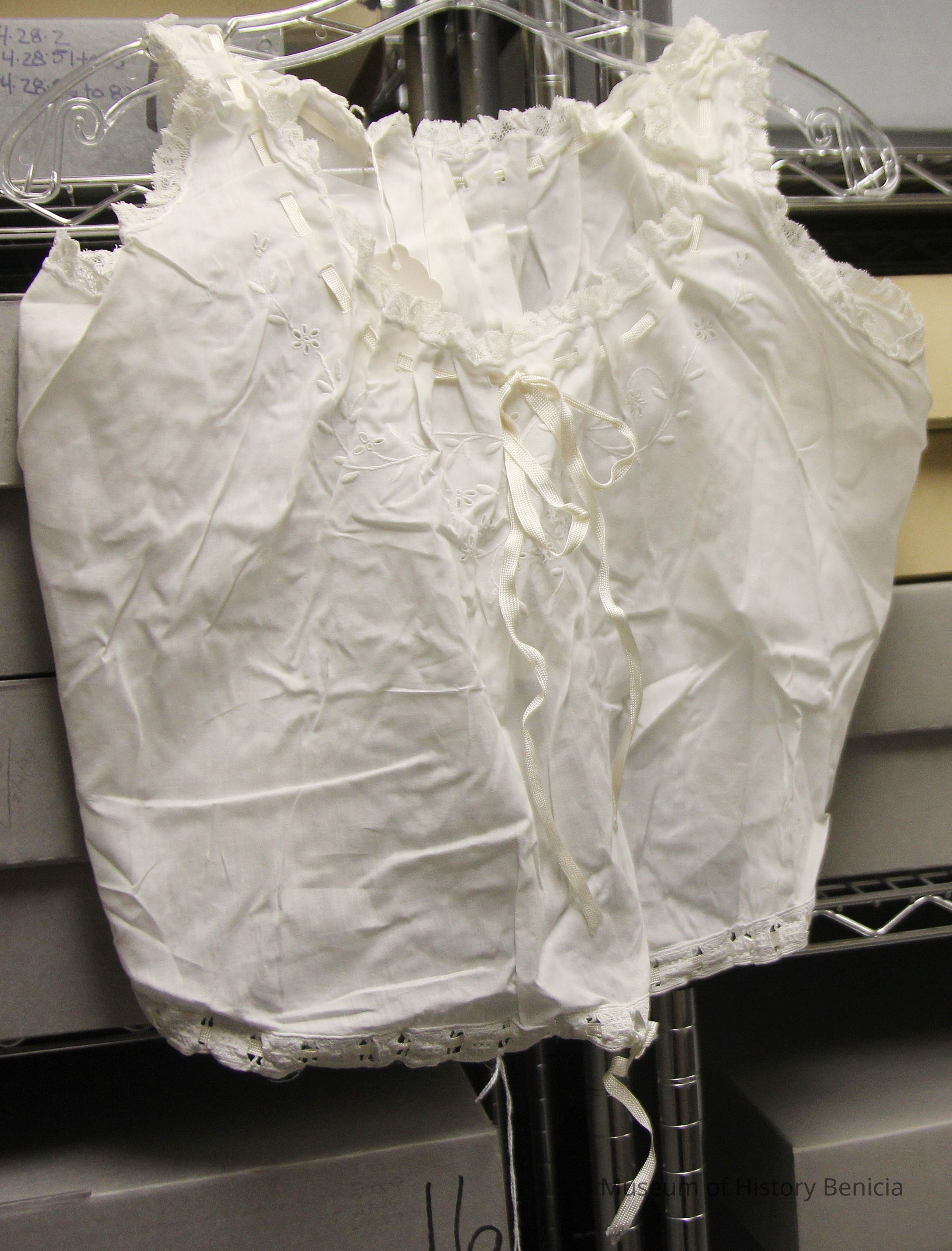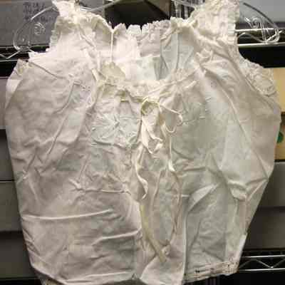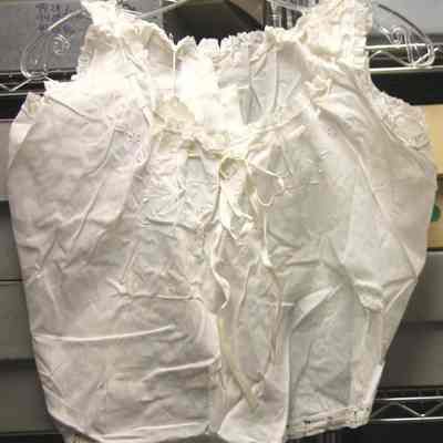White camisole with embroidered flowers on a vine the border has 1 inch squares all around white lace at the neck, back, and arms of the garmet.