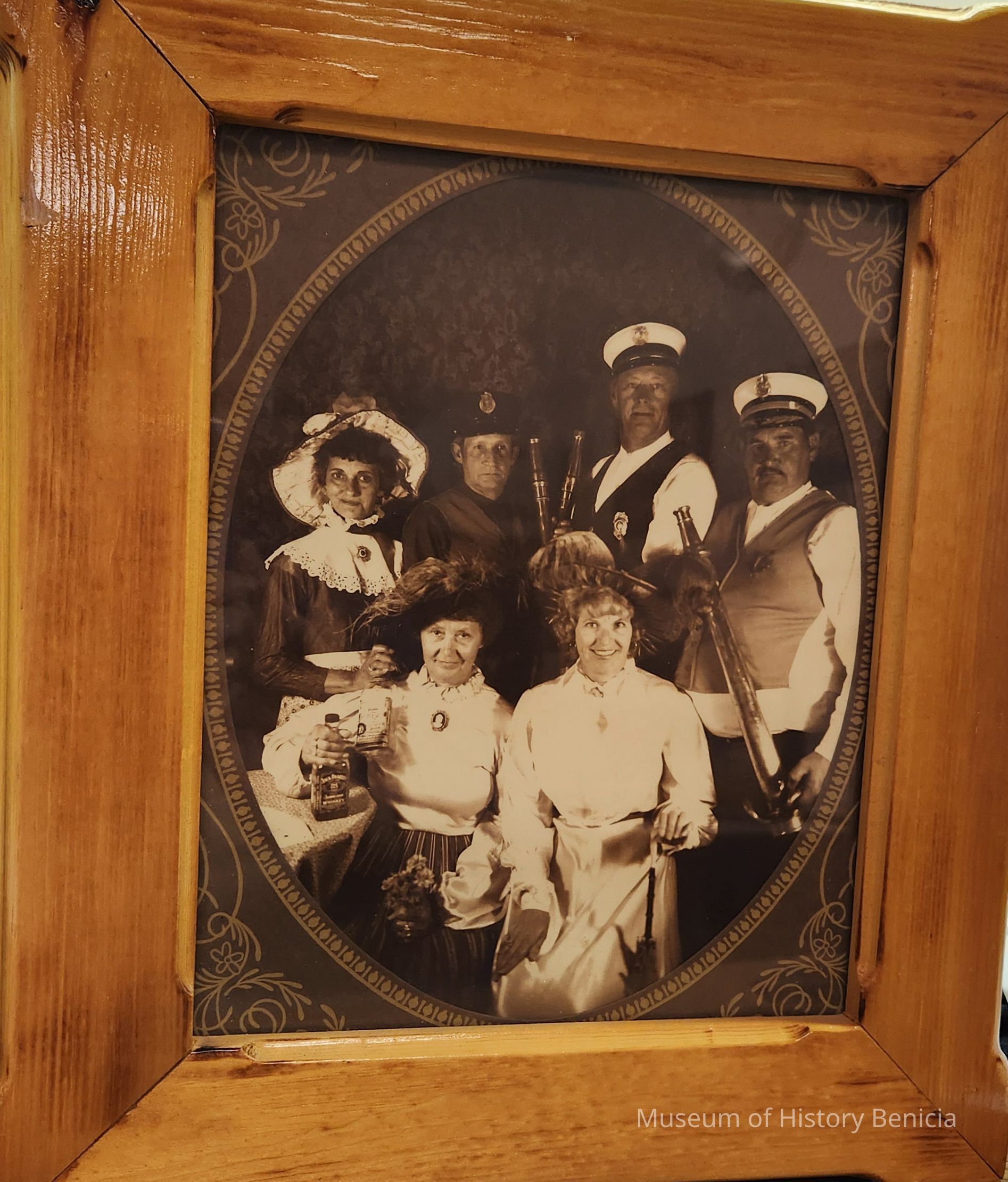 Sepia-tone photograph in a wood frame under glass; in vintage clothing the individuals are identified (on back) as back row: Georgina Rice, Bill Kelsey, Earl Book, Ron Rice and seated: Pills Book, Meg KelseyCollection