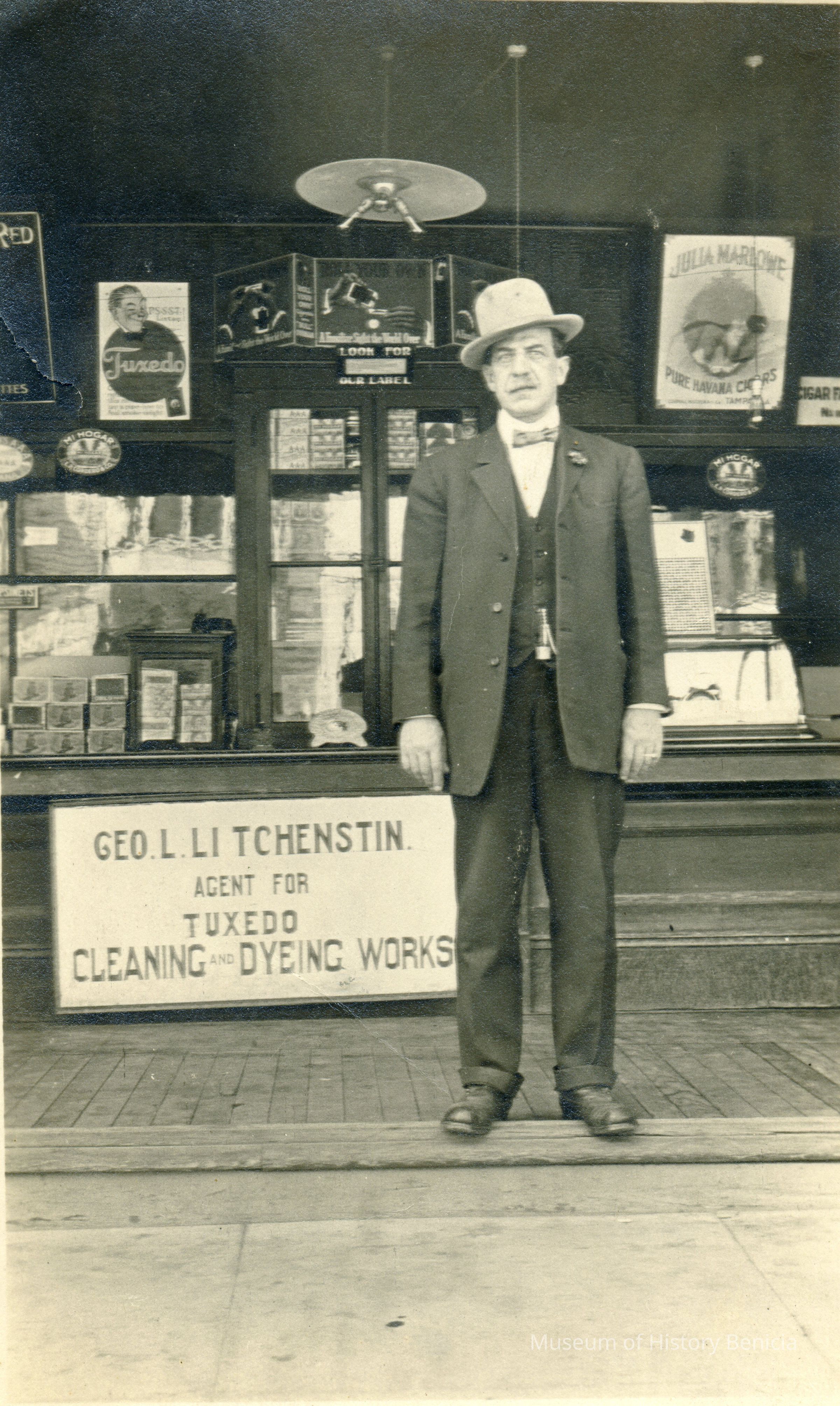 This is a photo of the George Litchenstin Cleaning and Dyeing Works. It shows a man outside the store who is believed to be Mr. Litchenstin.Collection
