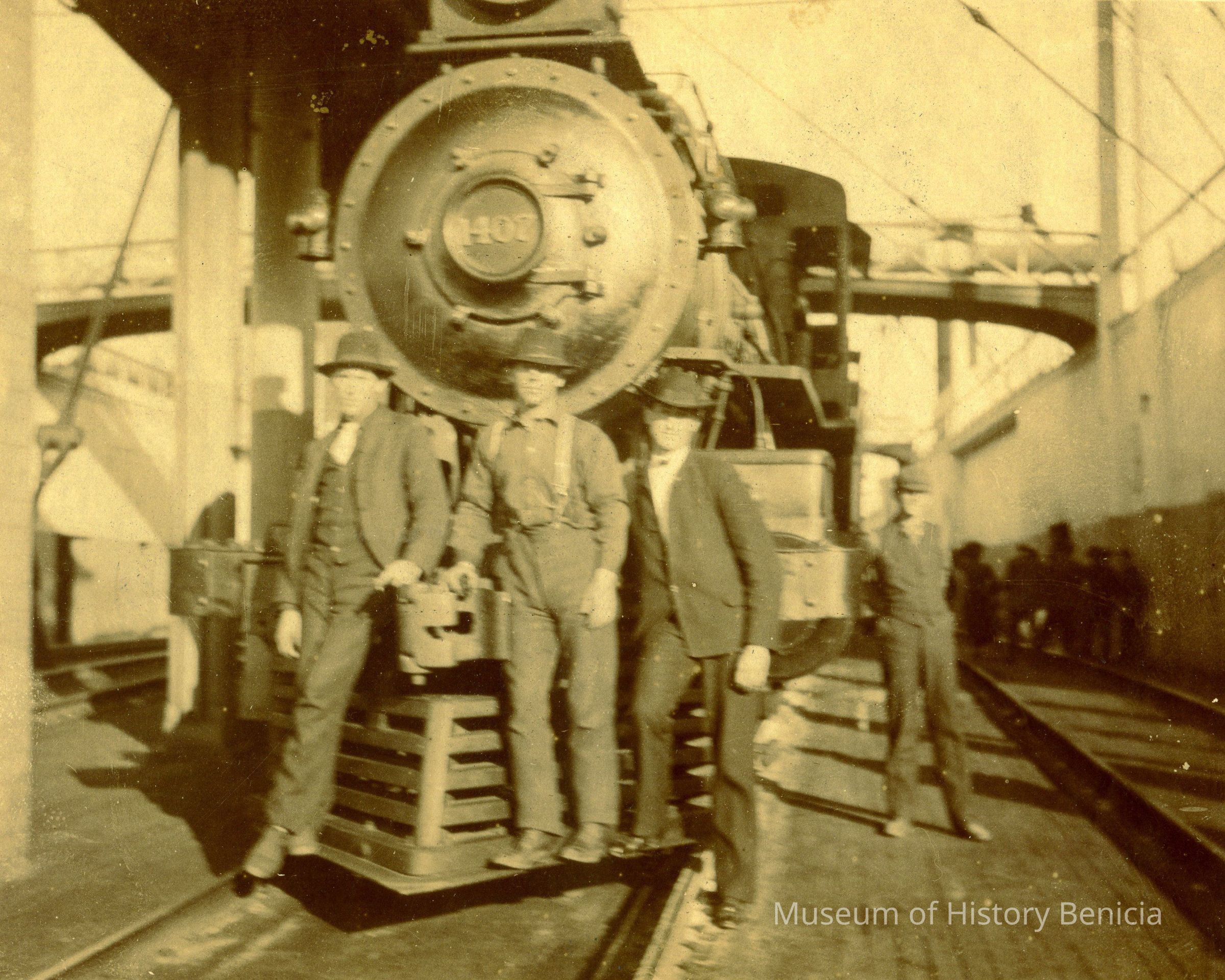 Engine on the Solano. Ferries in the dock. 3 men posed on the engine and engine number is 4402.