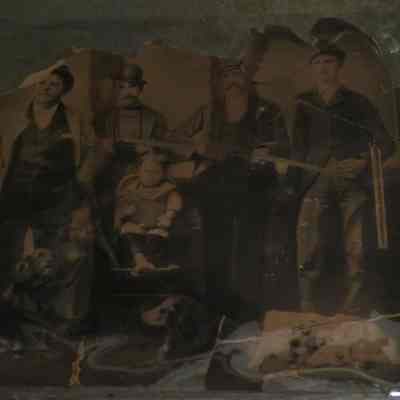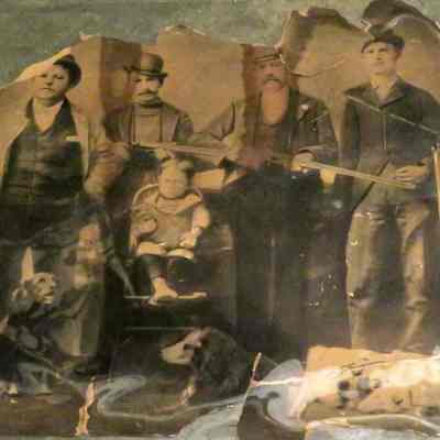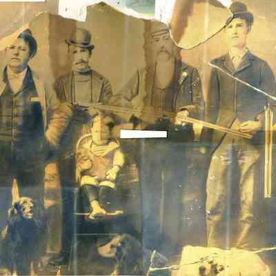 Photograph of 4 men holding rifles and a young boy in a high chair and 3 logs lying at their feet. The men may be hunters.