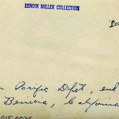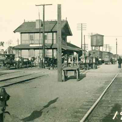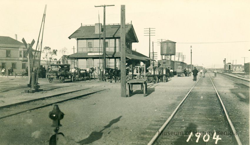 This is an old photograph showing the Southern Pacific train depot at the end of First St. in Benicia. The year 1904 is shown on the lower right corner of the photo. Several wagons are parked at the station including a milk wagon.Collection