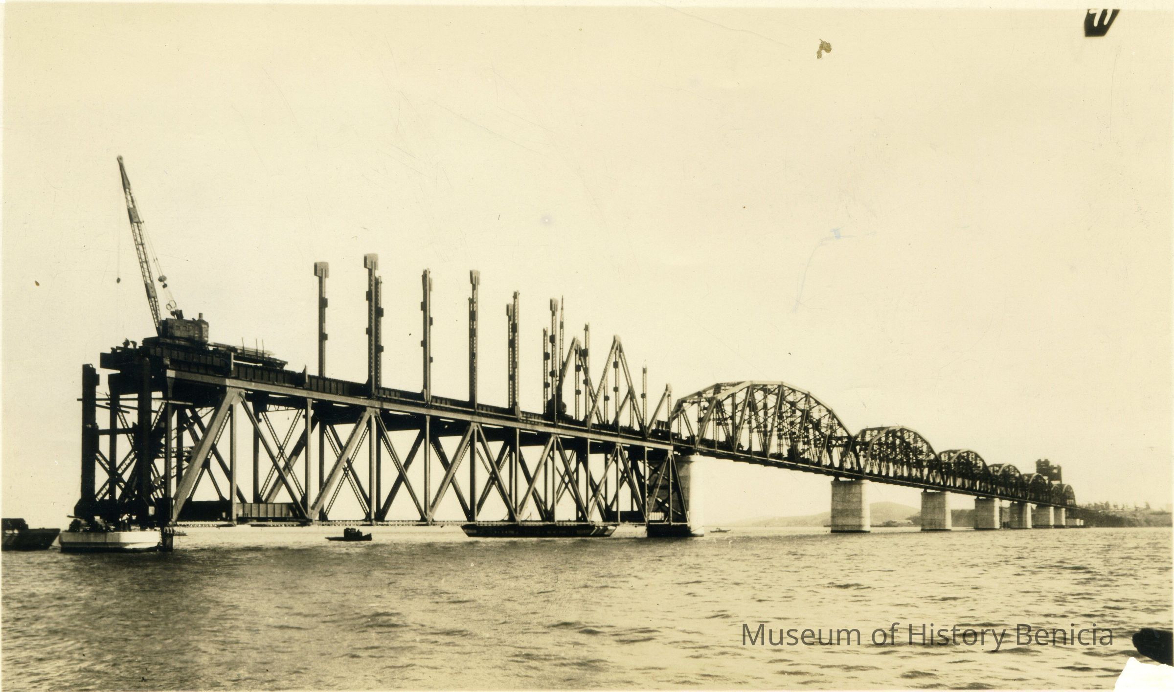 This is a photograph of the Southern Pacific railroad bridge being built in the 1930s.