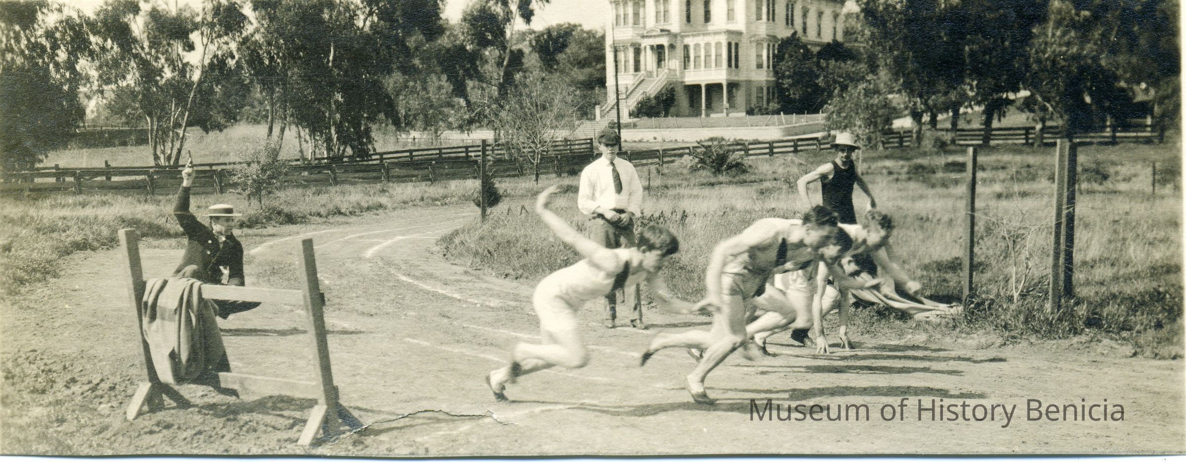 This is a photograph of the Benicia High School track team on a track near the Hastings house. One man is wearing a "boater" hat and firing a starting gun. There are five athletes running the race. The photo has been cut in half. The back says "High School Track, Benicia, Hastings house in background".Collection