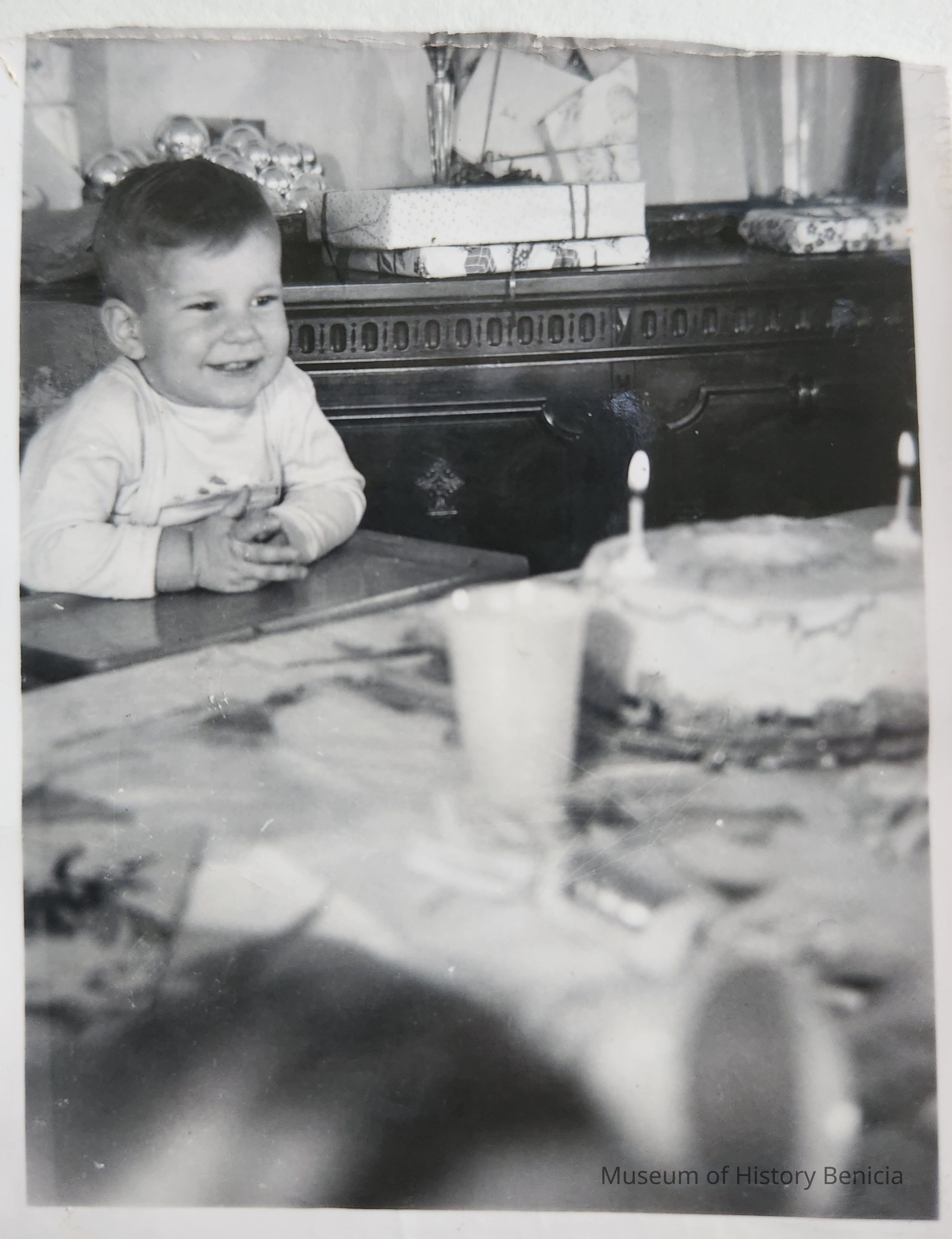 B/W Photograph of a young boy in a high chair looking at a cake with two burning candles on it. This boy could be David Henderson, son of Joe and Helen Henderson.