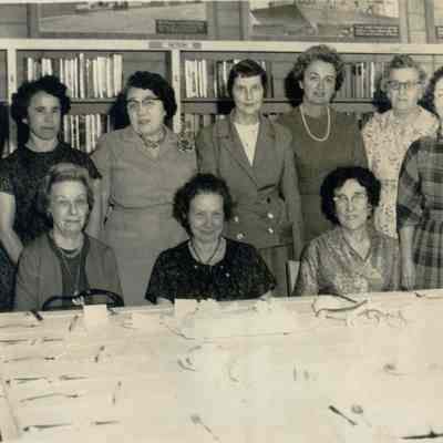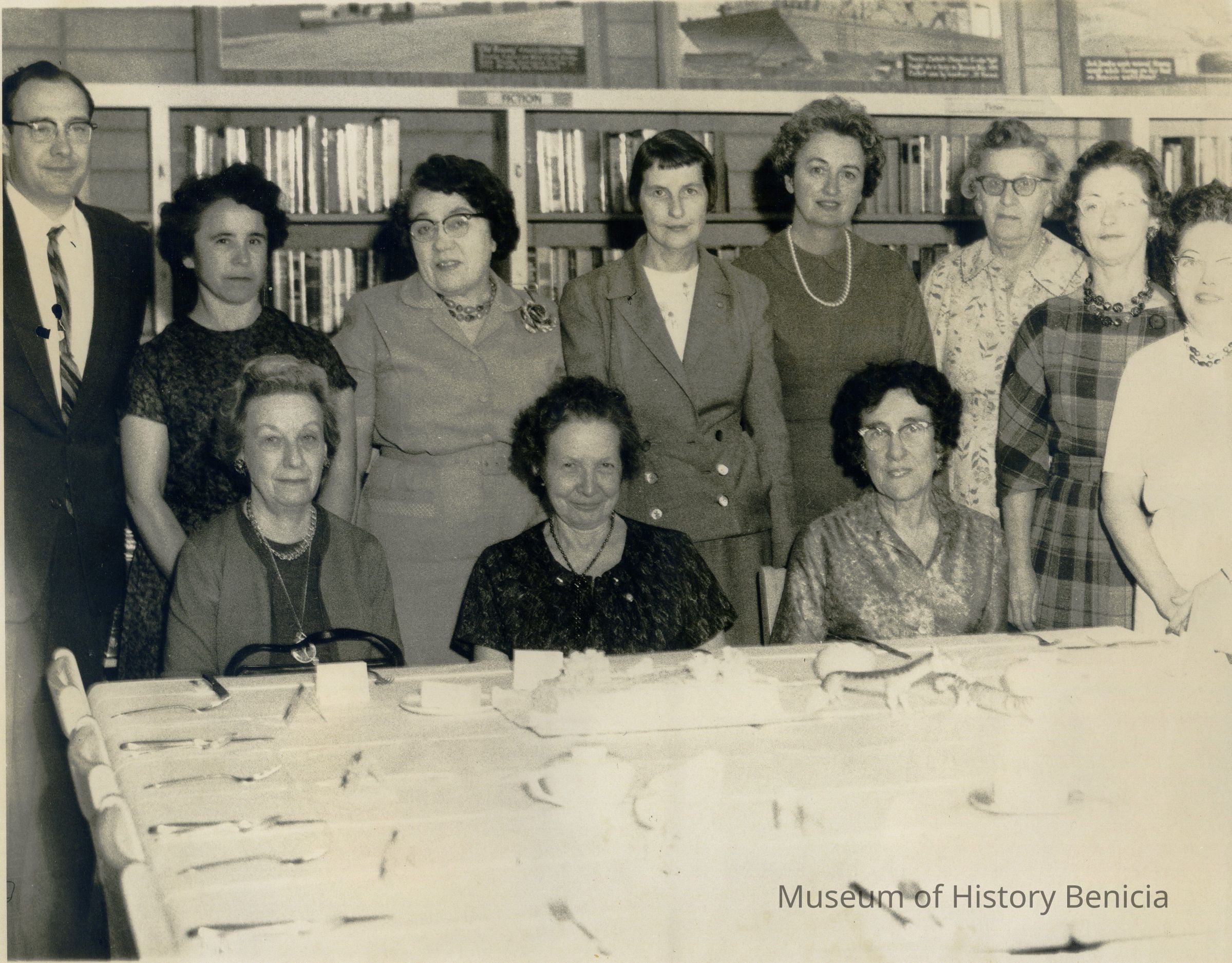 This is a photo of a group of women and one man (librarians?) at the Benicia public library. They are in front of a table set for a luncheon with a cake.Collection