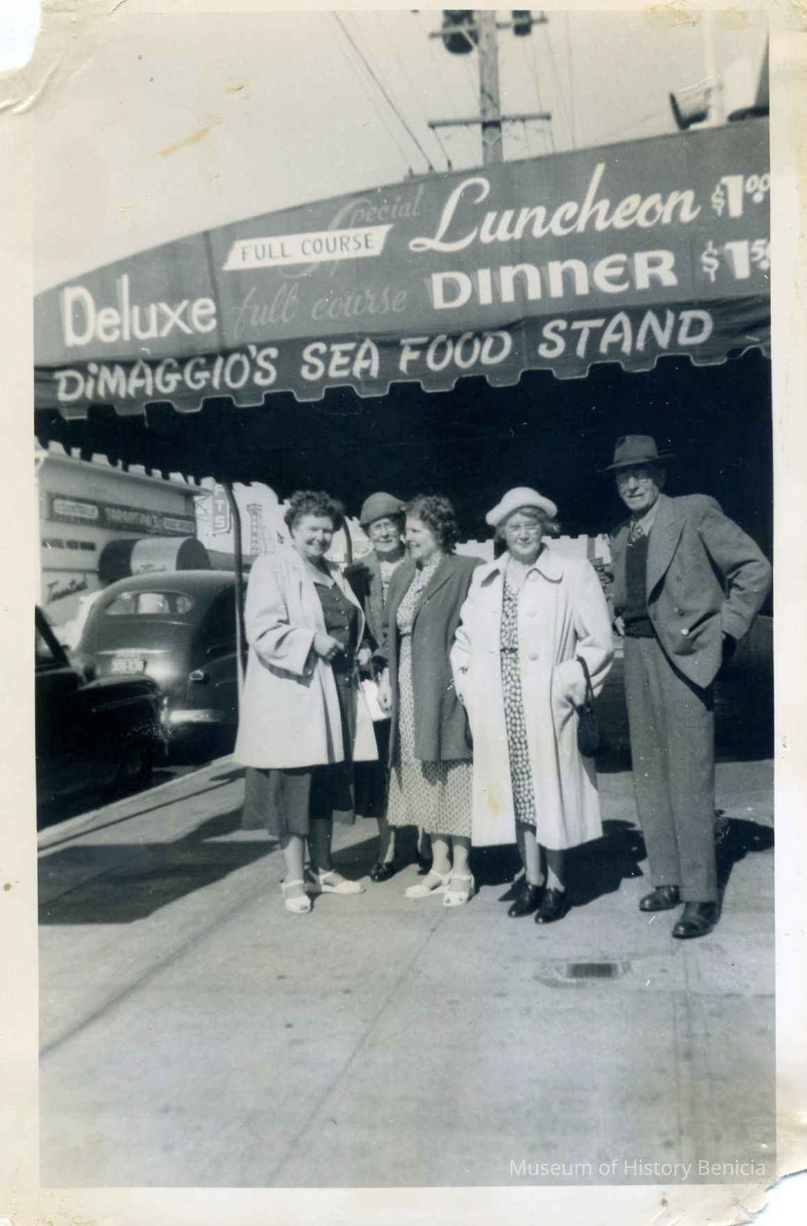 B/W Photograph of five people in front of DiMaggio's Restaurant in San Franciso's Fisherman's Wharf. Scallop-edged photograph.