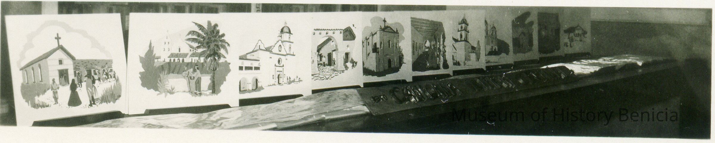 This is looks like a photo of the Califonia Missions as drawings.