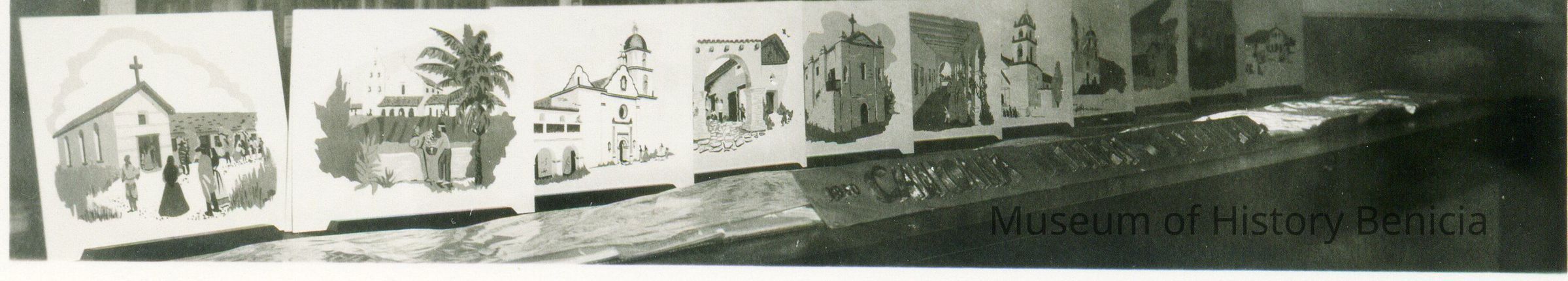 This is looks like a photo of the Califonia Missions as drawings.