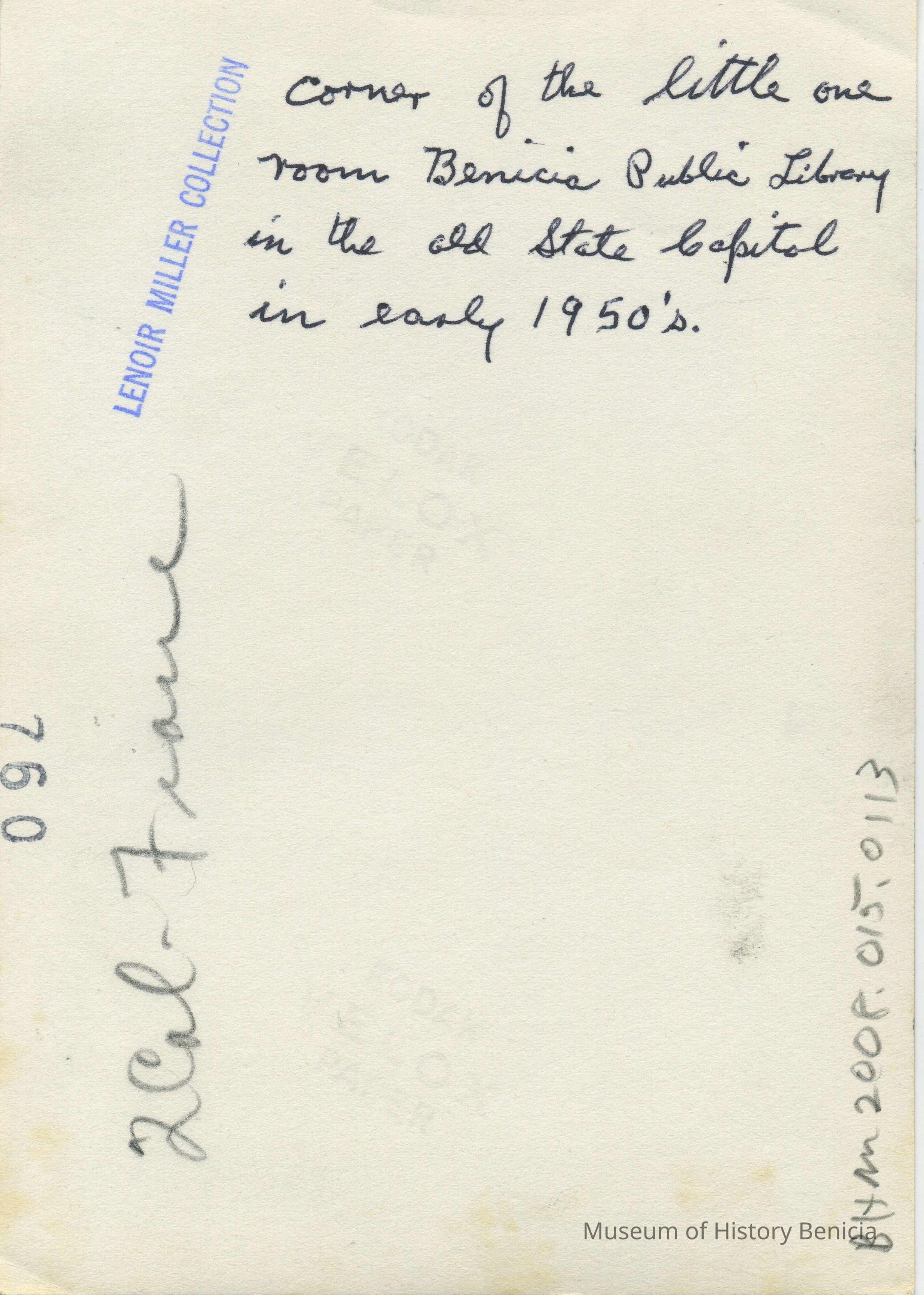 This is a photo of the Benicia Public Library in the Old State Capitol from the 1950s. The back says this is the "little one's" room in the Benicia Public Library when it was in the Old State Capitol in the early 1950's.Collection