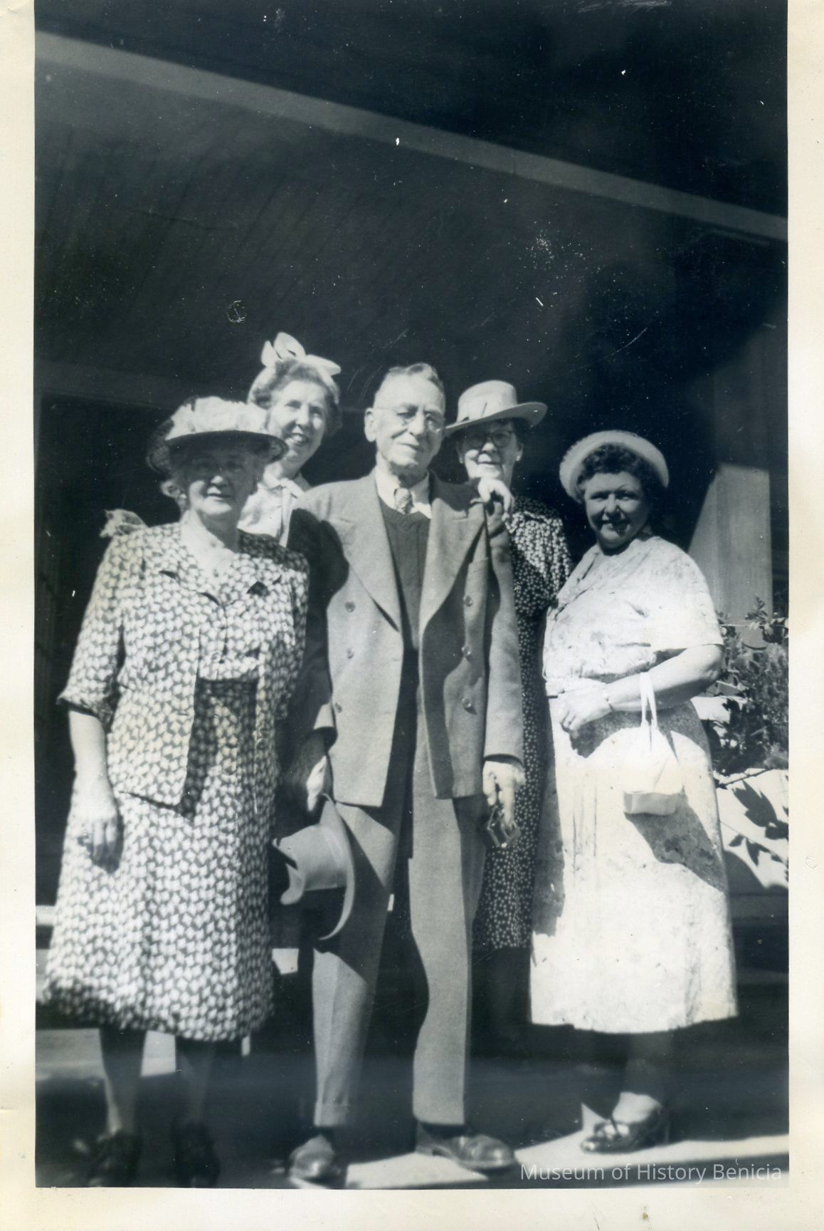 B/W Photograph of two men and three women posing somewhere in San Francisco, Scallop-edged Photograph.