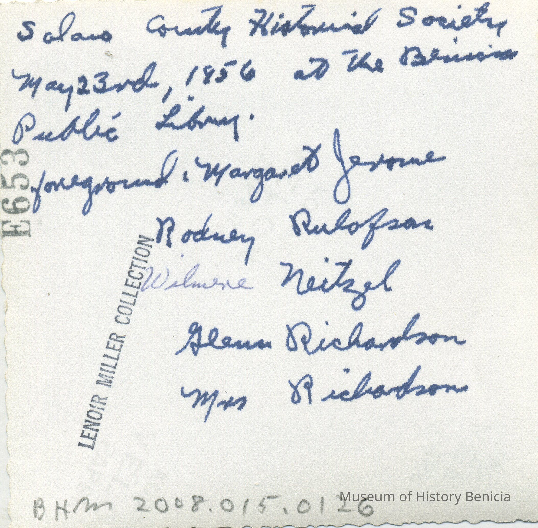 This is a photo of the Benicia Public Library with members of the Solano County Historical Society on 05/23/1956. Shown are: