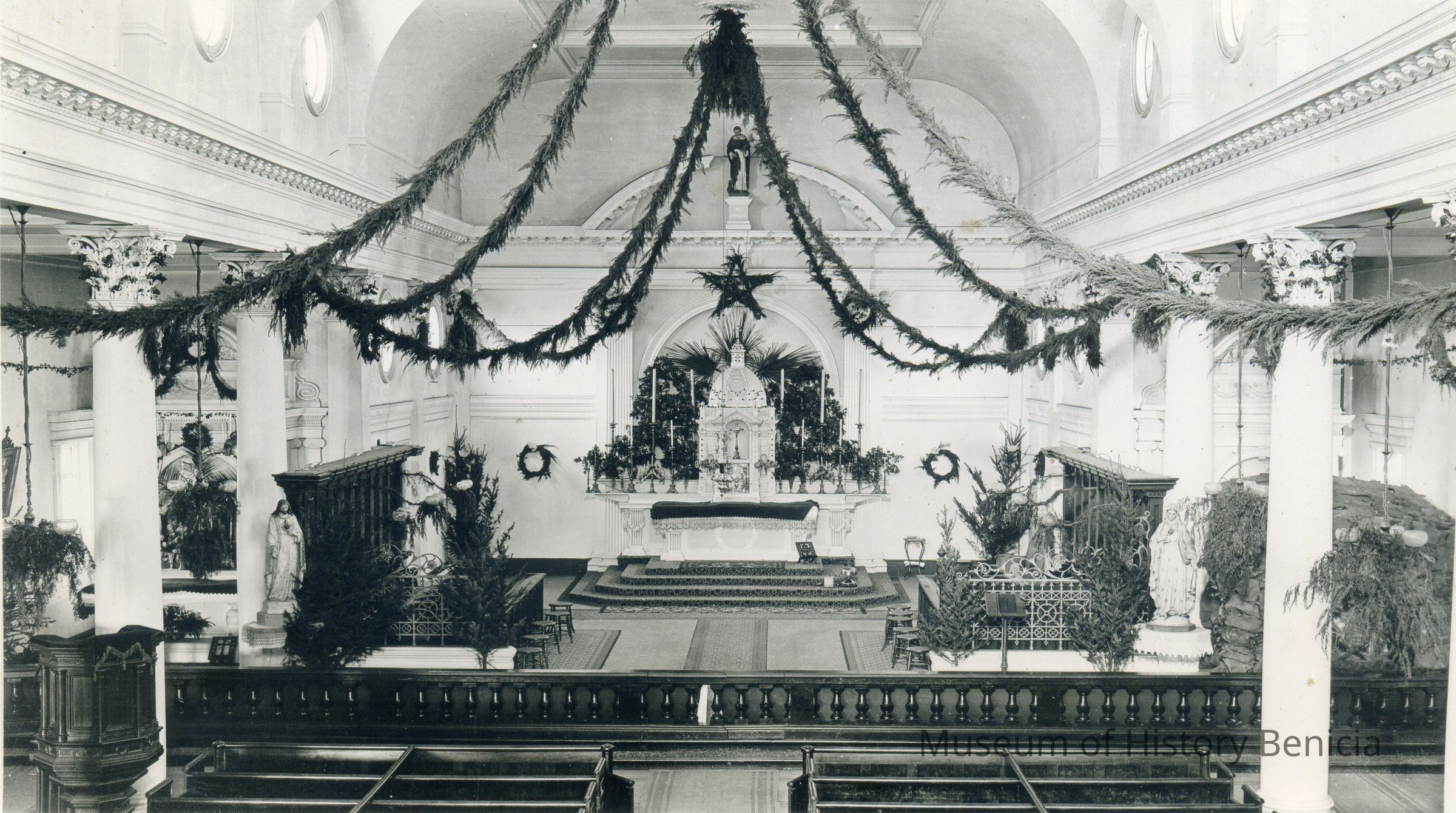 Photo of the alter at St. Dominic's church in Benicia. It is taken from in the balcony. The back says "interior of St. Dominic's Benicia , early 1900s". It is decorated for Christmas.Collection