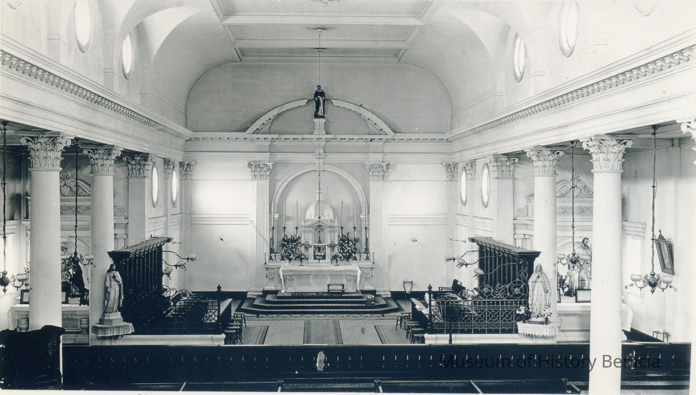 Photo of the alter at St. Dominic's church in Benicia. It is taken from in the balcony. There is a young priest praying on the right side of the alter.Collection