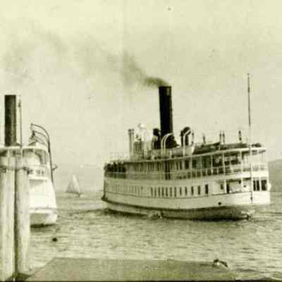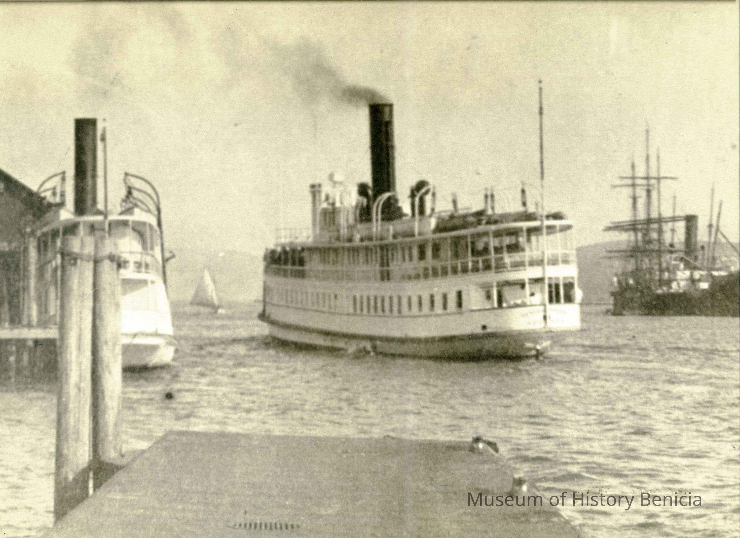 This is a photo of a ferryboat in the Carquinez Strait with other ships. It is eithrer leaving or arriving at the dock.