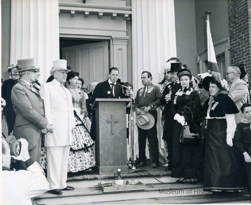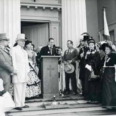 Photo of the Benicia State Capitol celebration with someone at a podium and people in period costume standing around. The actor Leo Carrillo is standing to the speaker's left.