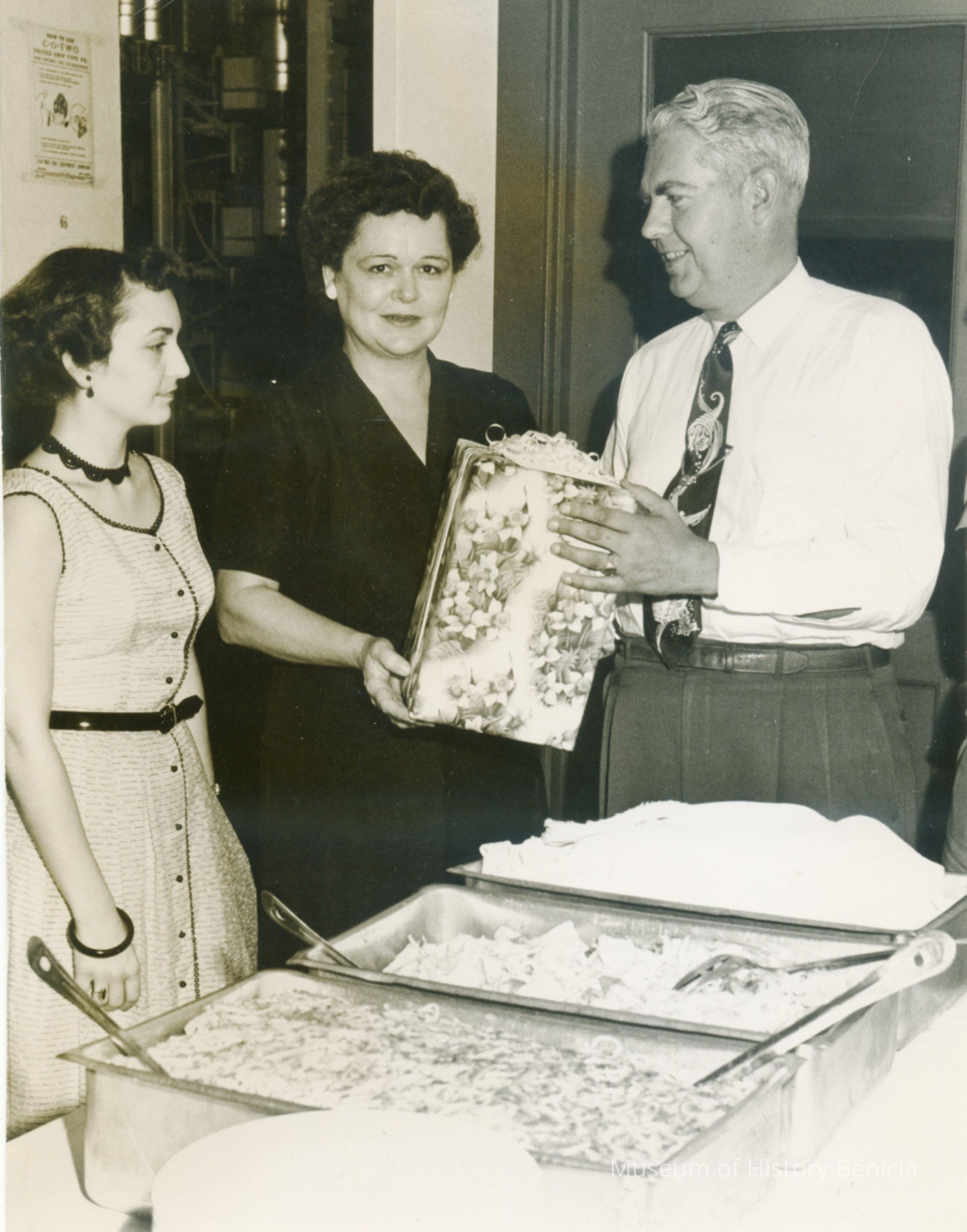 Photo of a man at a luncheon giving or receiving a package from a woman with a younger woman standing next to them. Not sure what the event is but the people are Walter Kamb, maybe Eve Taylor and the younger woman is unknown.Collection