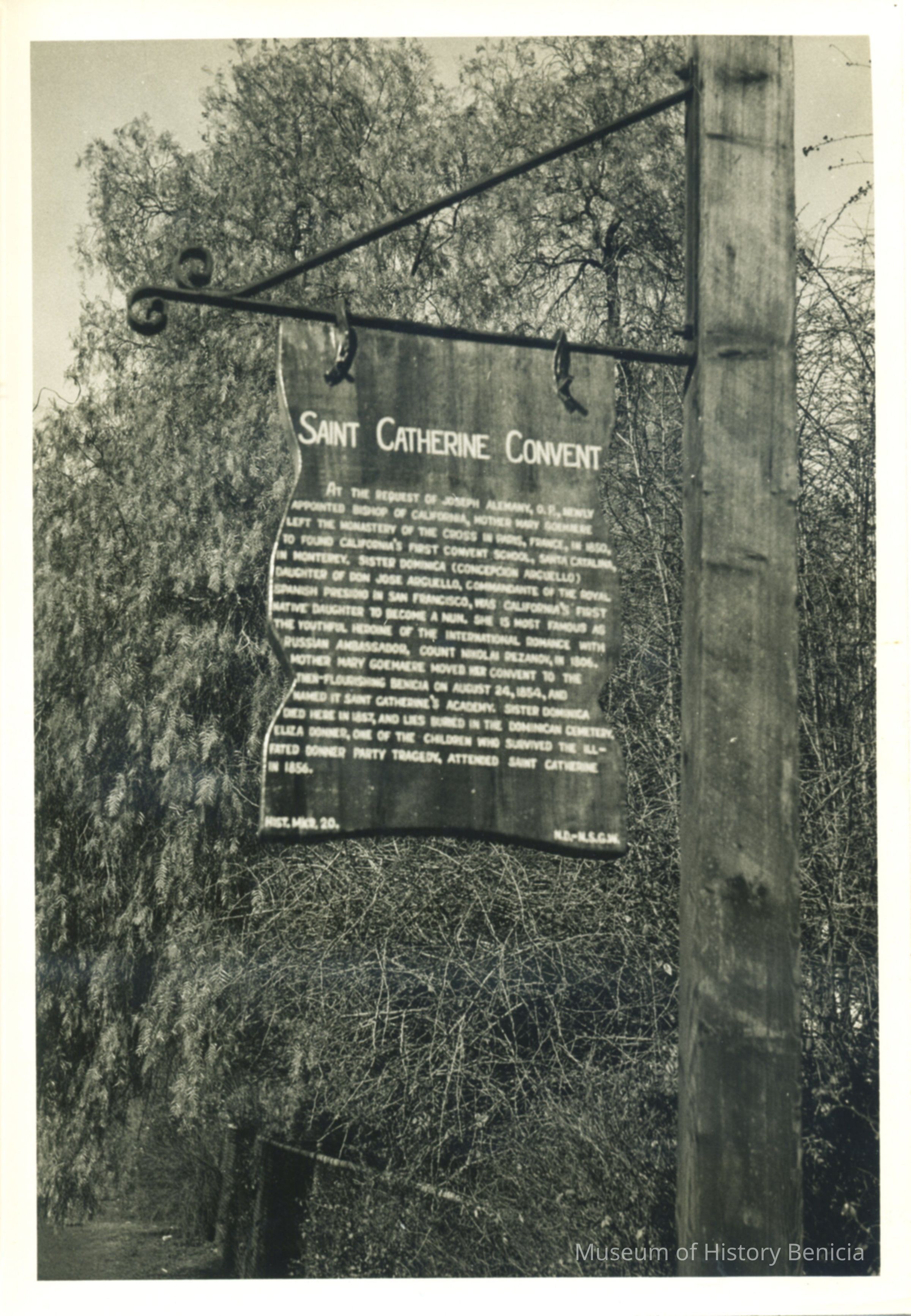 Sign titled Saint Catherine Convent hanging from wood post.