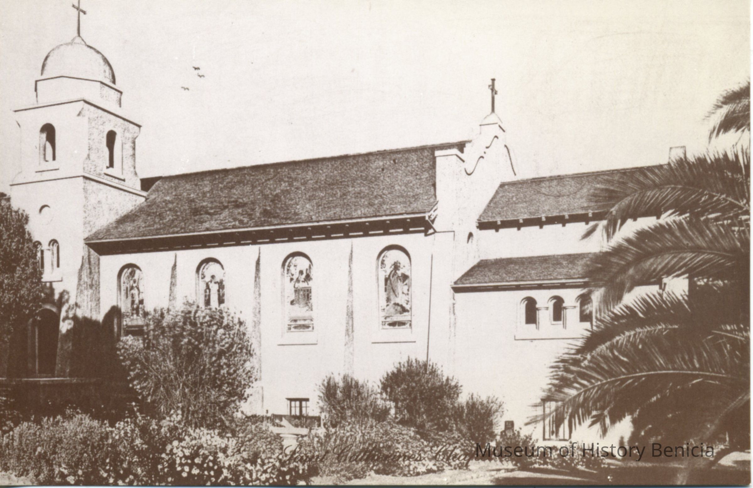 Saint Catherine's Chapel with stained glass windows and bell tower. All surrounded by shrubs and trees