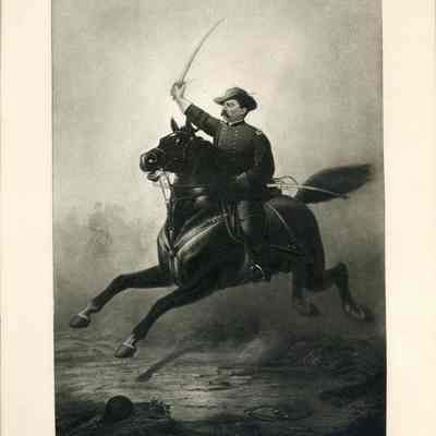 Print of General Phillip Sheridan riding a horse with his sword in the air.