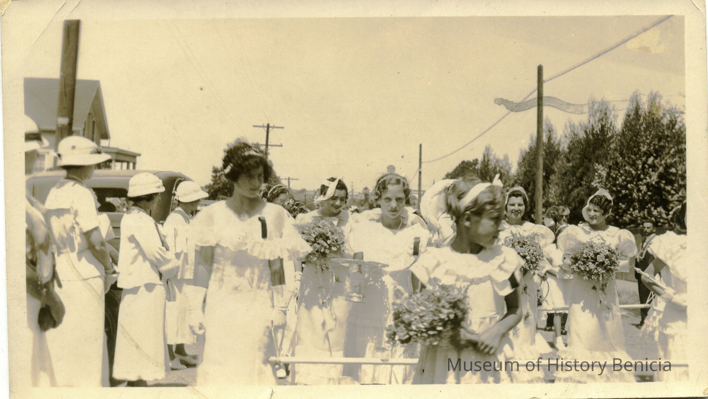 This is a photograph of many young women with bunches of flowers and all dressed in white. This could be a group from a Holy Ghost Celebration.Collection