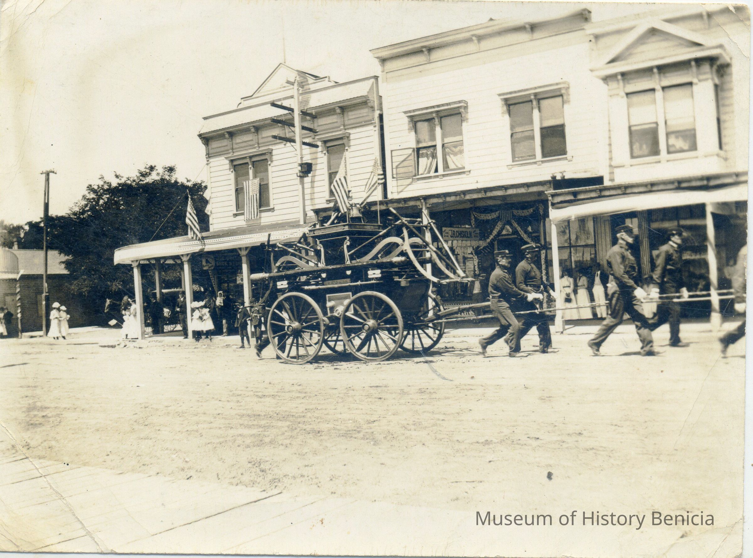 This is a photo of firemen pulling a pumper wagon on First Street in Benicia. There are flags displayed so it may be part of a 4th of July celebration. There is a sign on the wagon that says "Benicia" and a sign in the background for J.R. Chisholm.Collection