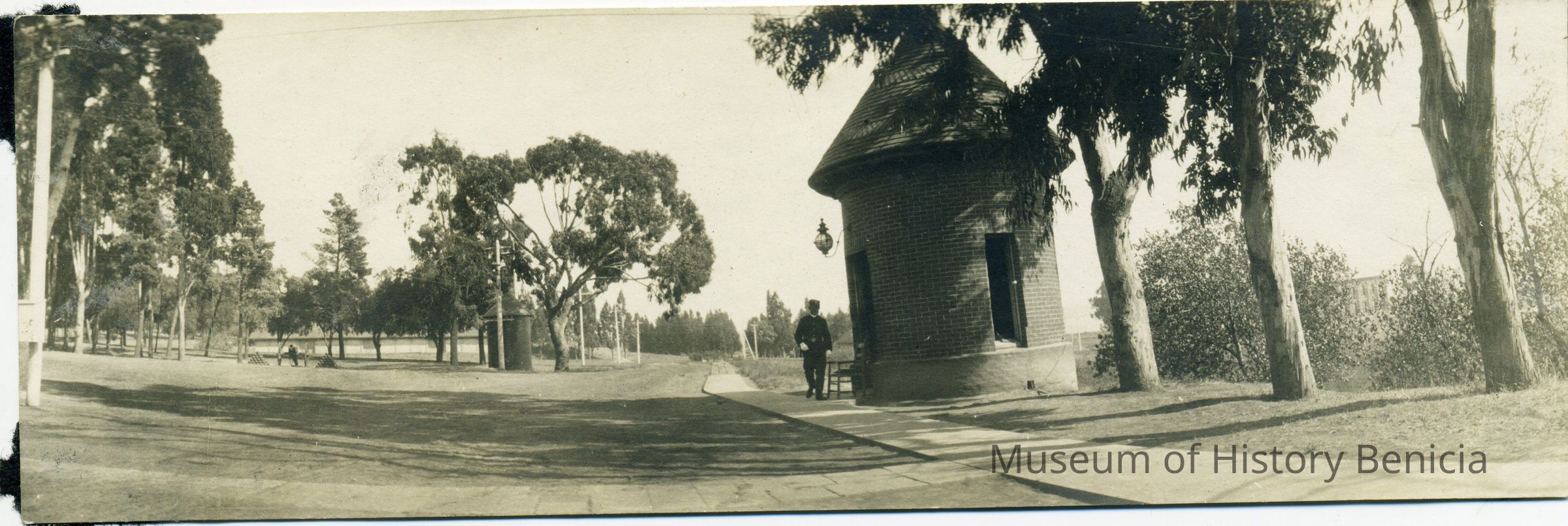 This is a photo of the main gate at the Benicia Arsenal. It shows the guard house but not the gates.