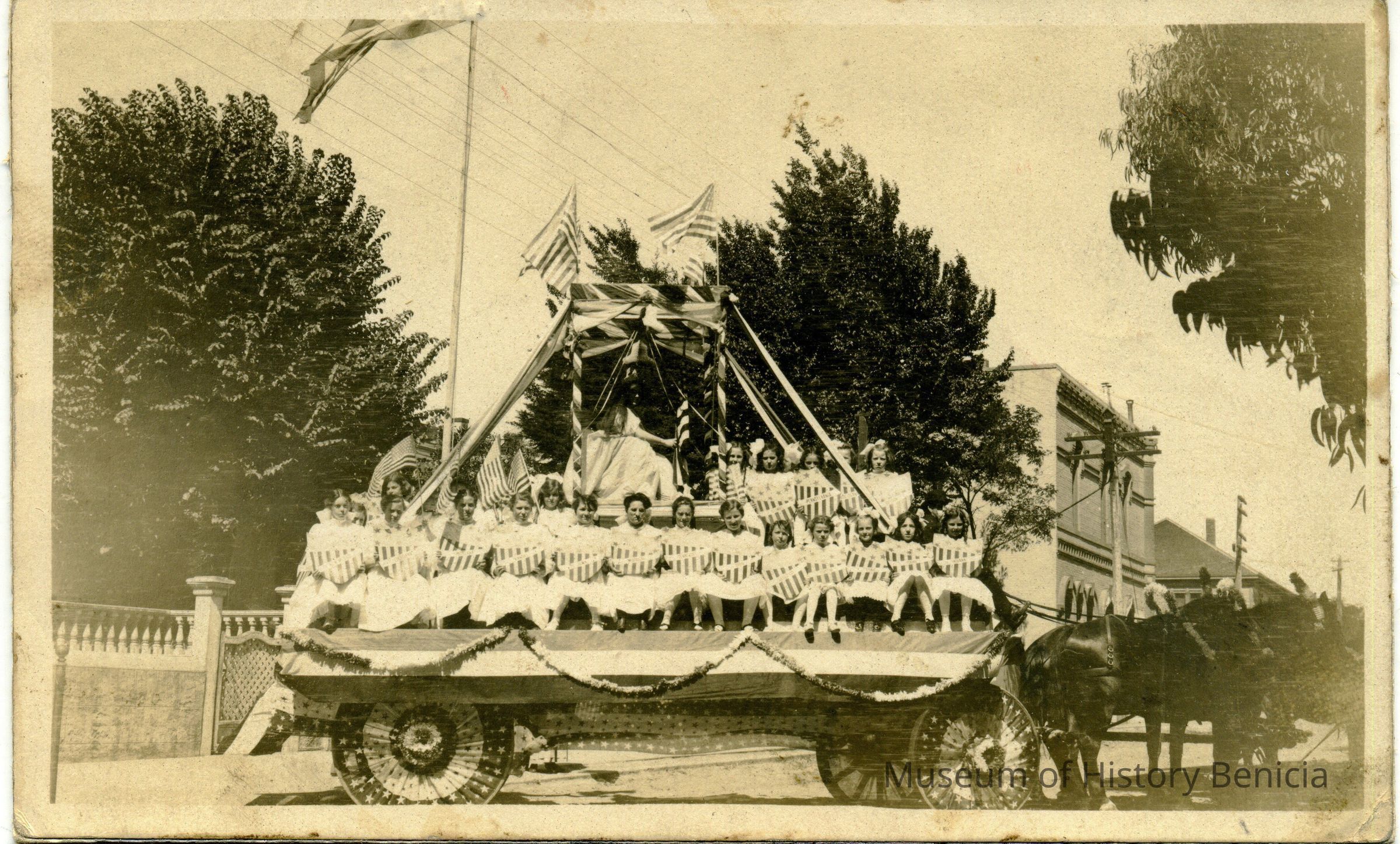 This is a photo of float called the "Goddess of Liberty" float from the 1908 parade. It is draped with bunting and has two rows of young girls sitting on it.Collection