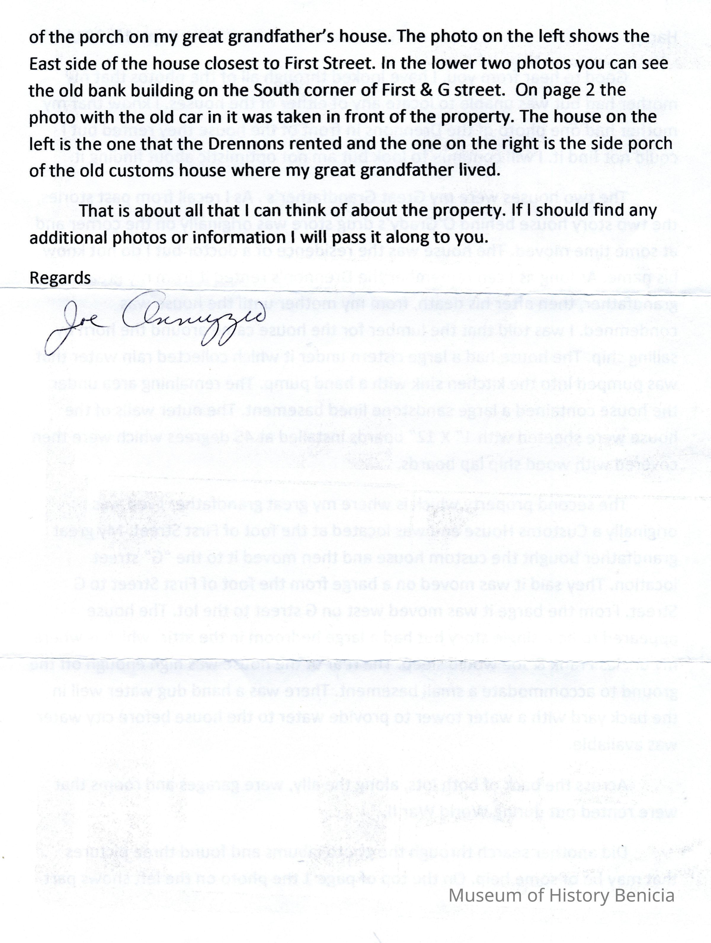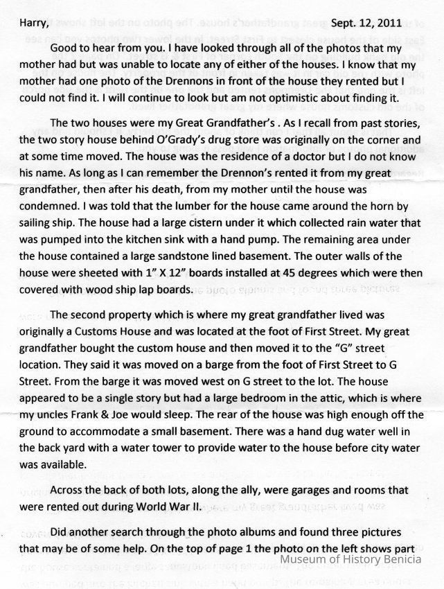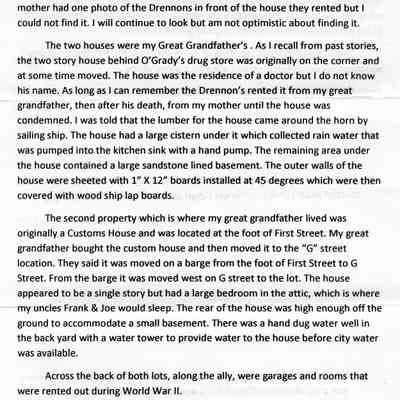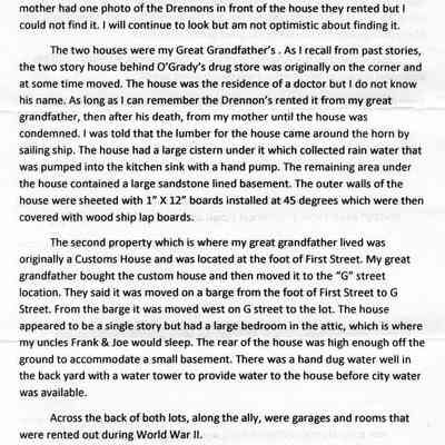 These photos were attached to a letter from Joe Annuzzio to Harry Wassmann in 09/212/2011. It seems that Harry had asked Joe about two houses that his family had owned. One was a house behind O'Grady's drug store on First street. It was rented to the Drennon family. Joe thinks that the lumber for the house came around the horn. It had a cistern and sandstone basement under the house.