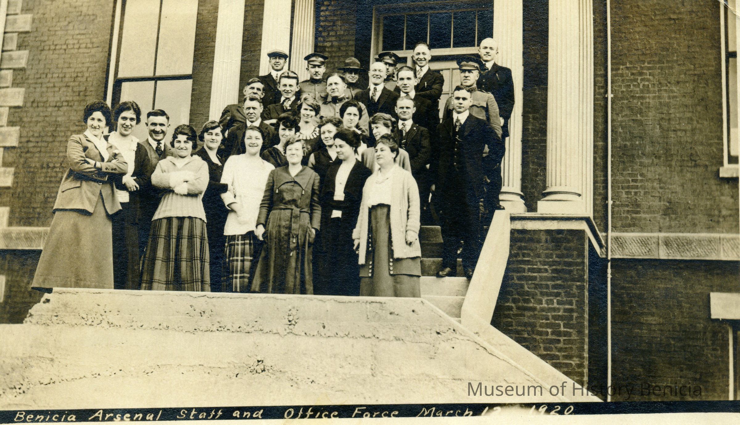This is a photo of the staff at the Benicia Arsenal on March 12 1920. The man on the right side whose shoes can be seen may be Mr. Giffles. Next to him may be "Tiny" Mendlor.Collection