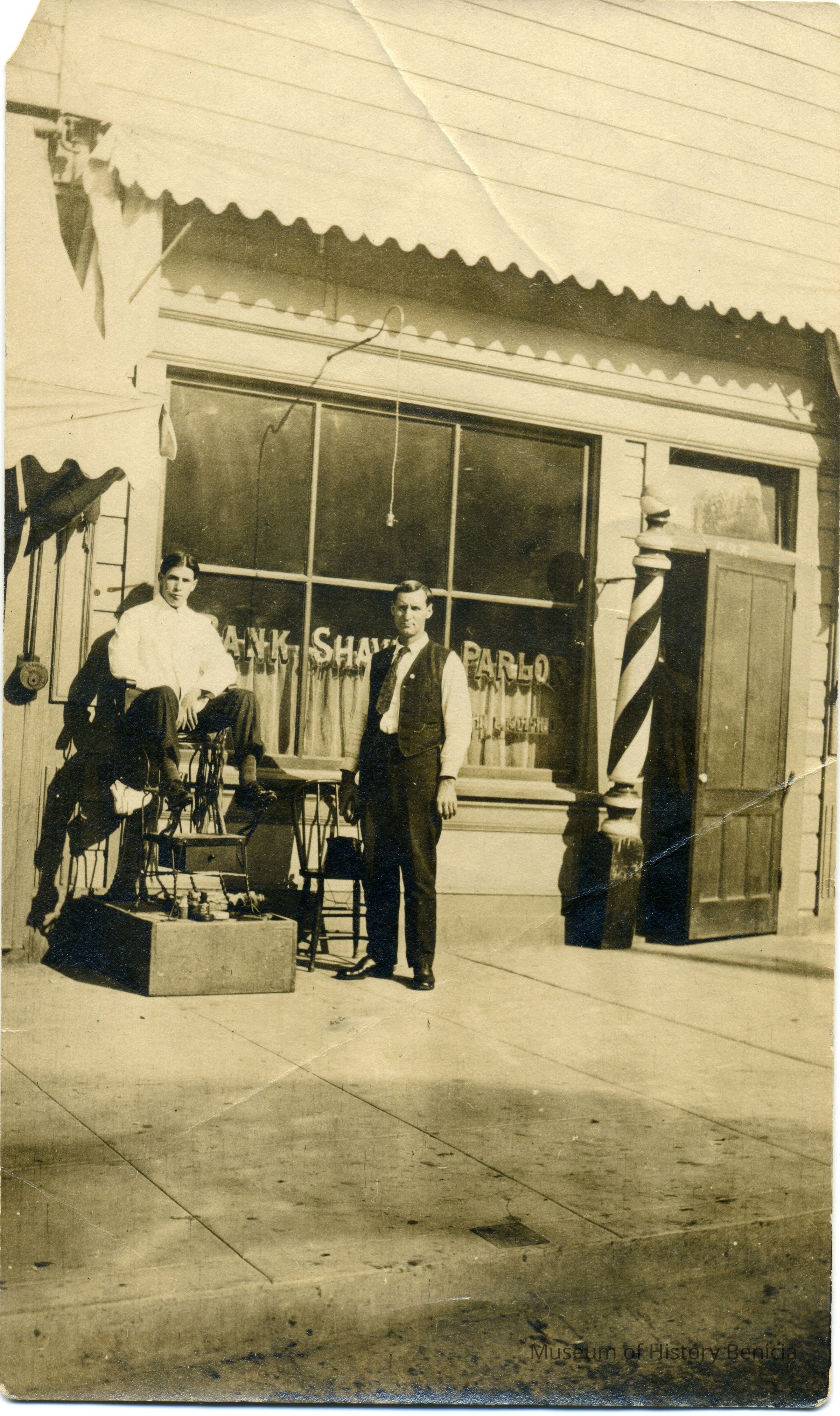 This is a photo of the Bank Shave Parlor. There are two unidentified men standing outside the barber shop and a barber poll next to the door. One man is sitting on a shoe shine stand.