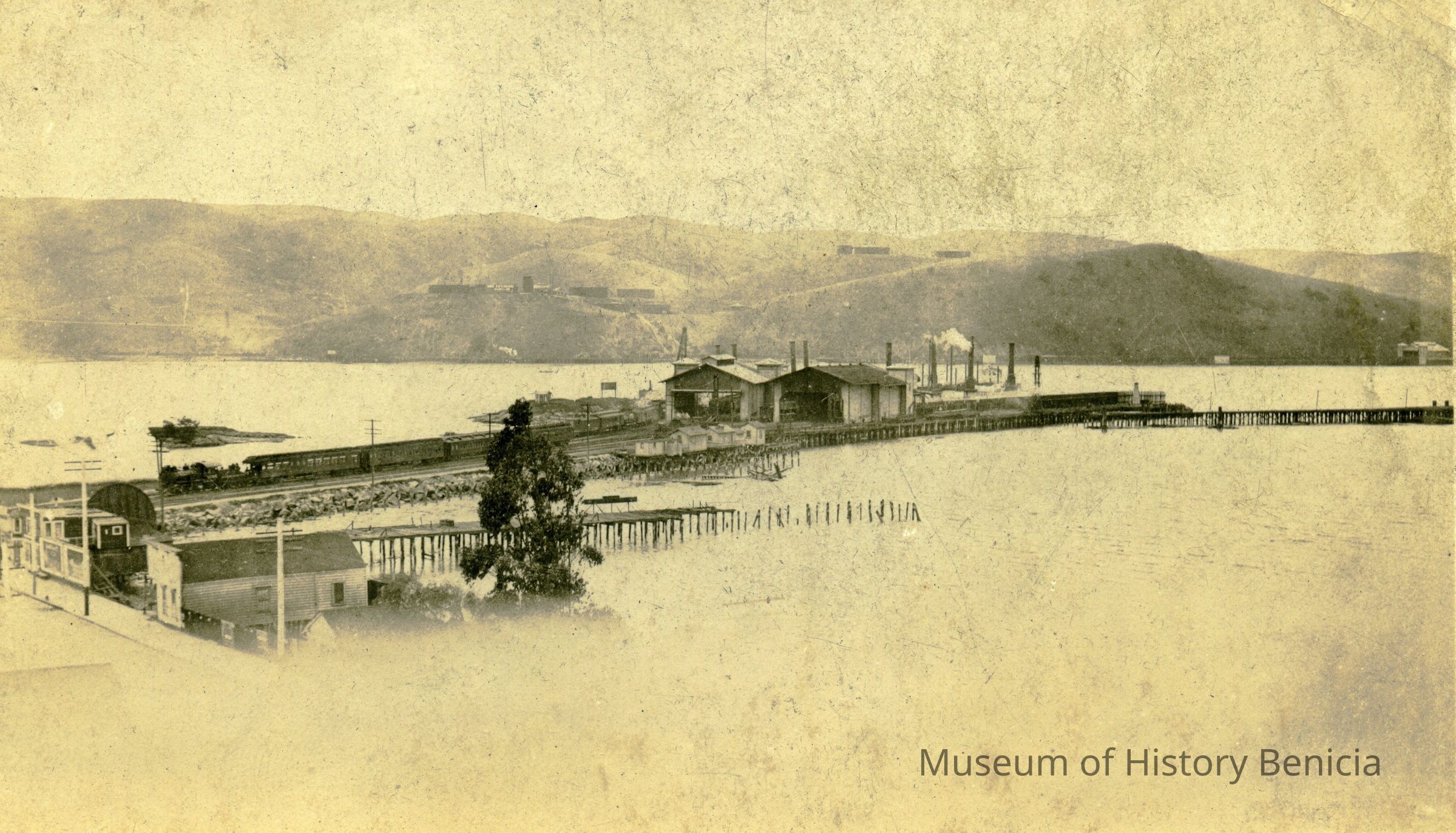 A view of Benicia and the shoreline. The ferry can be seen in the distance coming into the dock and trains on the tracks. This is similar to the photo in 2017.030.0545 but wthout showing many of the buildings on First street.Collection