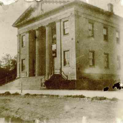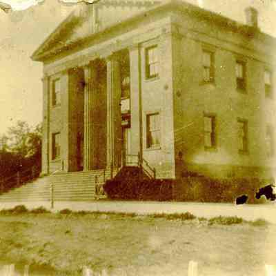 This is photograph of the Old State Capitol. It is a fairly early photo as there are dirt streets and no vines on the building or hedges in front. It still has the square window over the entrance and the pole going thru the middle.Collection