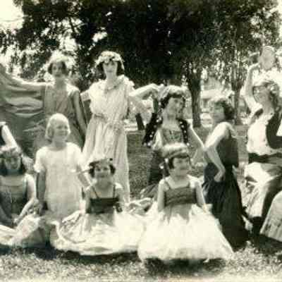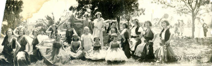 This is a panoramic photo women and girls dressed for the 1923 Solano History paegant. The back has the names Nilda and Melba Passalacqua.Collection