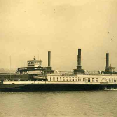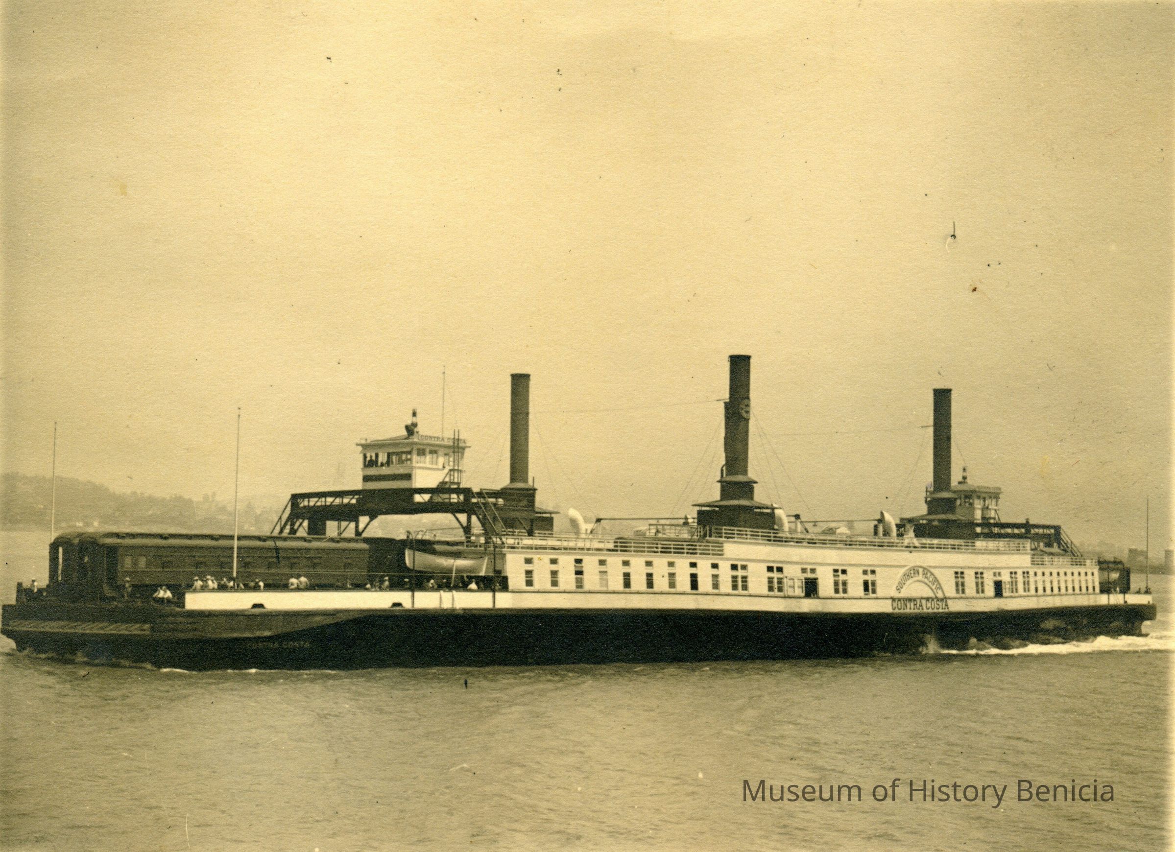 This is a photo of the Southern Pacific Contra Costa ferry. It is underway on the Bay with a train onboard.